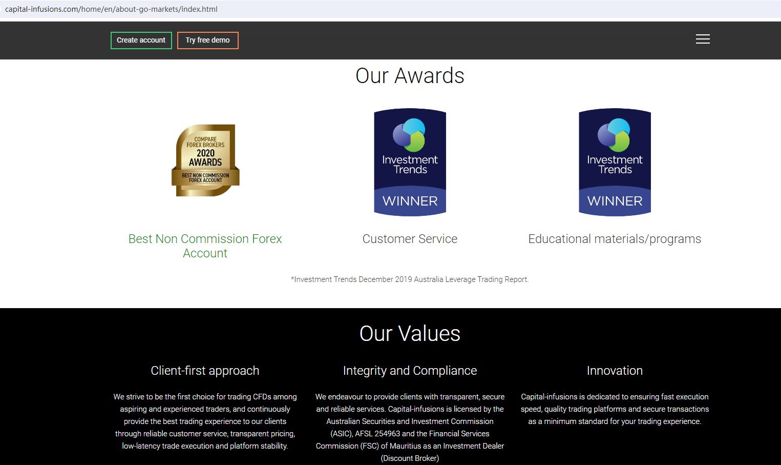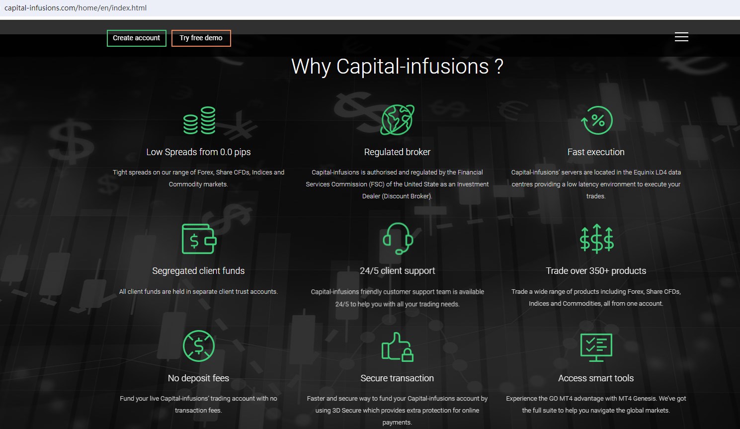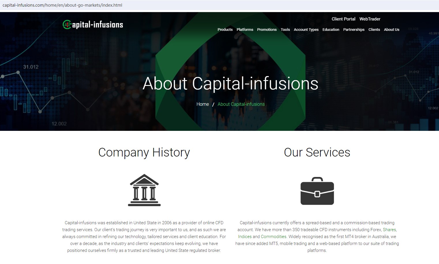 Capital-infusions claims to be a provider of online CFD trading services established in United State, licensed by the Australian Securities and Investment Commission (ASIC) with AFSL 254963, authorised and regulated by the Financial Services Commission (FSC) of Mauritius as an Investment Dealer, providing a wide range of trading services to traders, including Forex, Share, Indices, Metals, Commodities and more instruments in global markets.