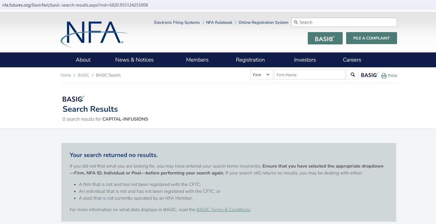 The truth is that Capital-infusions is not regulated by any regulators. Letting it hold or control investors' money is unsafe, and the money can not be protected by any laws.