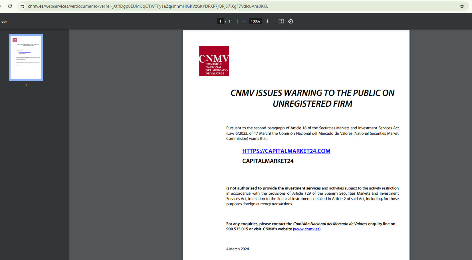 On March 4, 2024, the Comisión Nacional del Mercado de Valores (CNMV) added CAPITALMARKET24 to its warning list for providing investment services without authorization. https://www.cnmv.es/portal/ResultadoBusqueda.aspx?tipo=1&nombre=CAPITALMARKET24