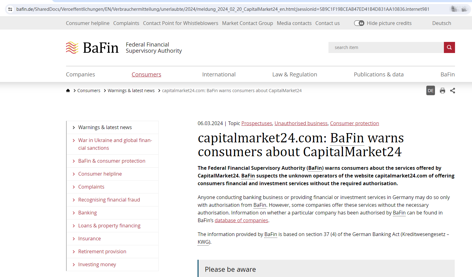 On 6 March 2024, the Federal Financial Supervisory Authority (BaFin) issued a warning that CAPITALMARKET24 was providing financial services or products without authorisation. You may visit: https://www.bafin.de/SharedDocs/Veroeffentlichungen/EN/Verbrauchermitteilung/unerlaubte/2024/meldung_2024_02_20_CapitalMarket24_en.html;jsessionid=5B9C1F19BCEAB47ED41B4D831AA10836.internet981