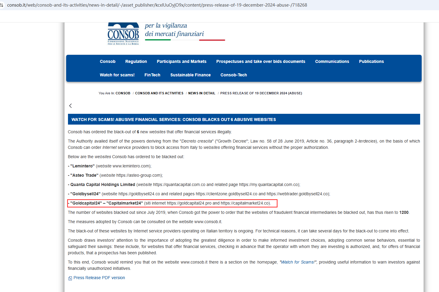 On December 19, 2024, the Italian Companies and Exchange Commission (CONSOB) ordered Capitalmarket24 to be blacked out since it offers financial services illegally in Italy. https://www.consob.it/web/consob-and-its-activities/news-in-detail/-/asset_publisher/kcxlUuOyjO9x/content/press-release-of-19-december-2024-abuse-/718268
