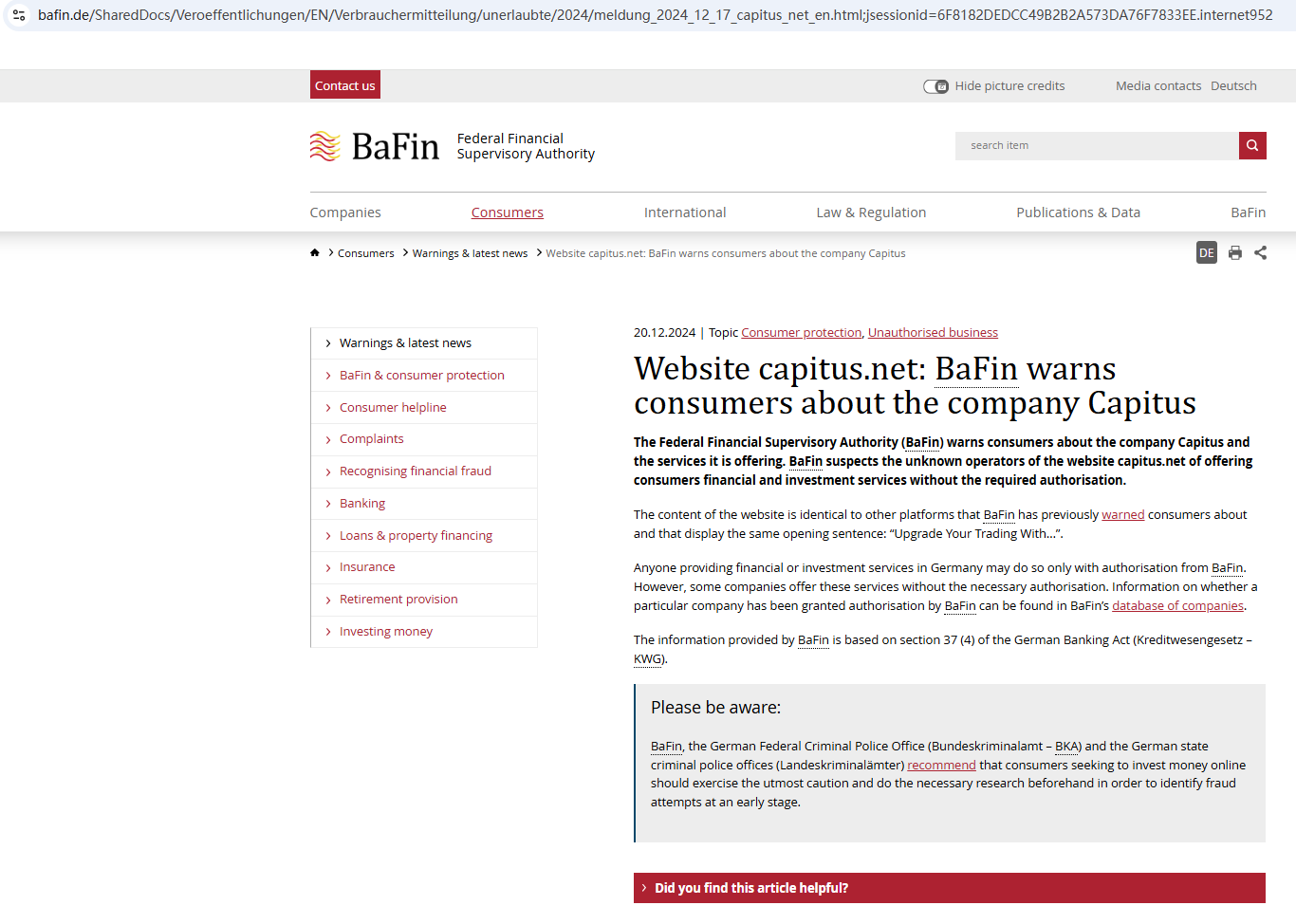 On December 20, 2024, the Federal Financial Supervisory Authority (BaFin) issued a warning against Capitus for operating without the required authorization. https://www.bafin.de/SharedDocs/Veroeffentlichungen/EN/Verbrauchermitteilung/unerlaubte/2024/meldung_2024_12_17_capitus_net_en.html;jsessionid=6F8182DEDCC49B2B2A573DA76F7833EE.internet952