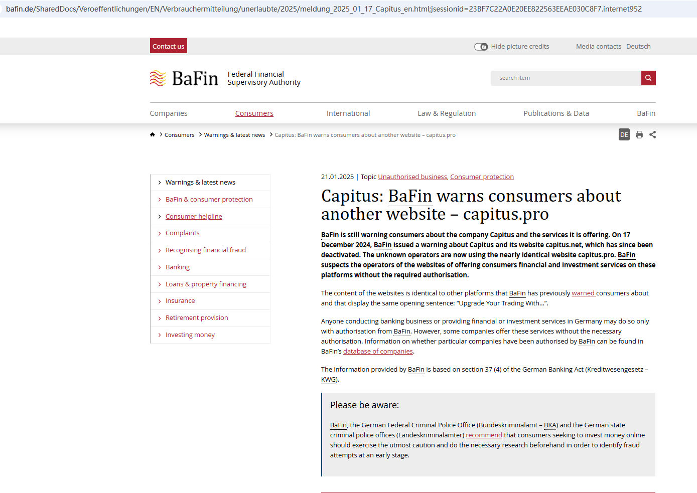 Capitus is still in business, continuing its fraudulent activities to steal money. Therefore, the BaFin updates its warning against Capitus, cautioning the public to stay away from this unauthorized firm. https://www.bafin.de/SharedDocs/Veroeffentlichungen/EN/Verbrauchermitteilung/unerlaubte/2025/meldung_2025_01_17_Capitus_en.html;jsessionid=23BF7C22A0E20EE822563EEAE030C8F7.internet952