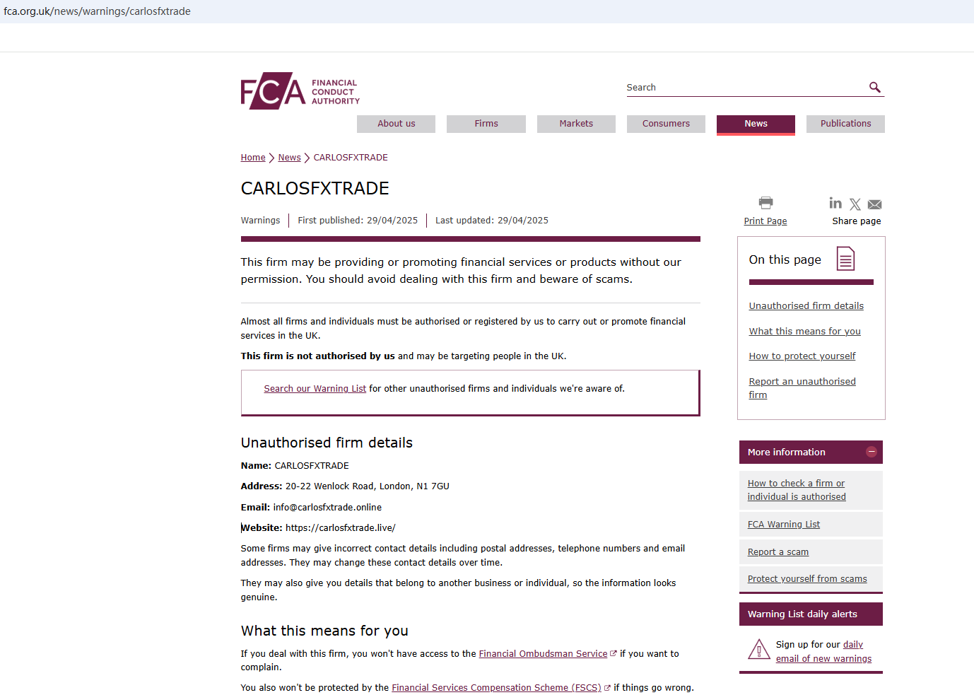 On April 29, 2025, the Financial Conduct Authority (FCA) issued a warning against CARLOSFXTRADE, believing this company might be providing financial services or products without proper authorization in the UK. https://www.fca.org.uk/news/warnings/carlosfxtrade