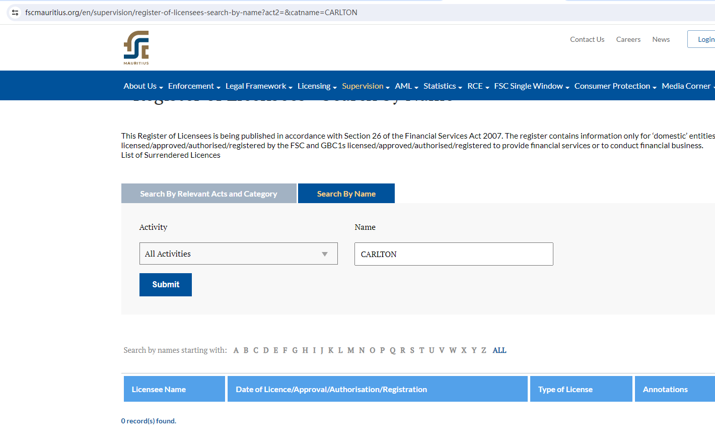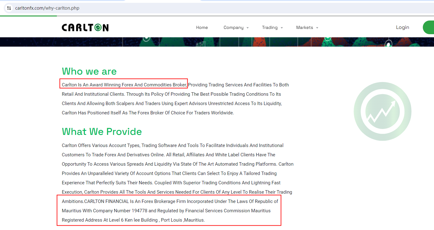Carlton claims to be regulated by the Financial Services Commission, Mauritius (FSC), we searched the FSC but found no matching results.