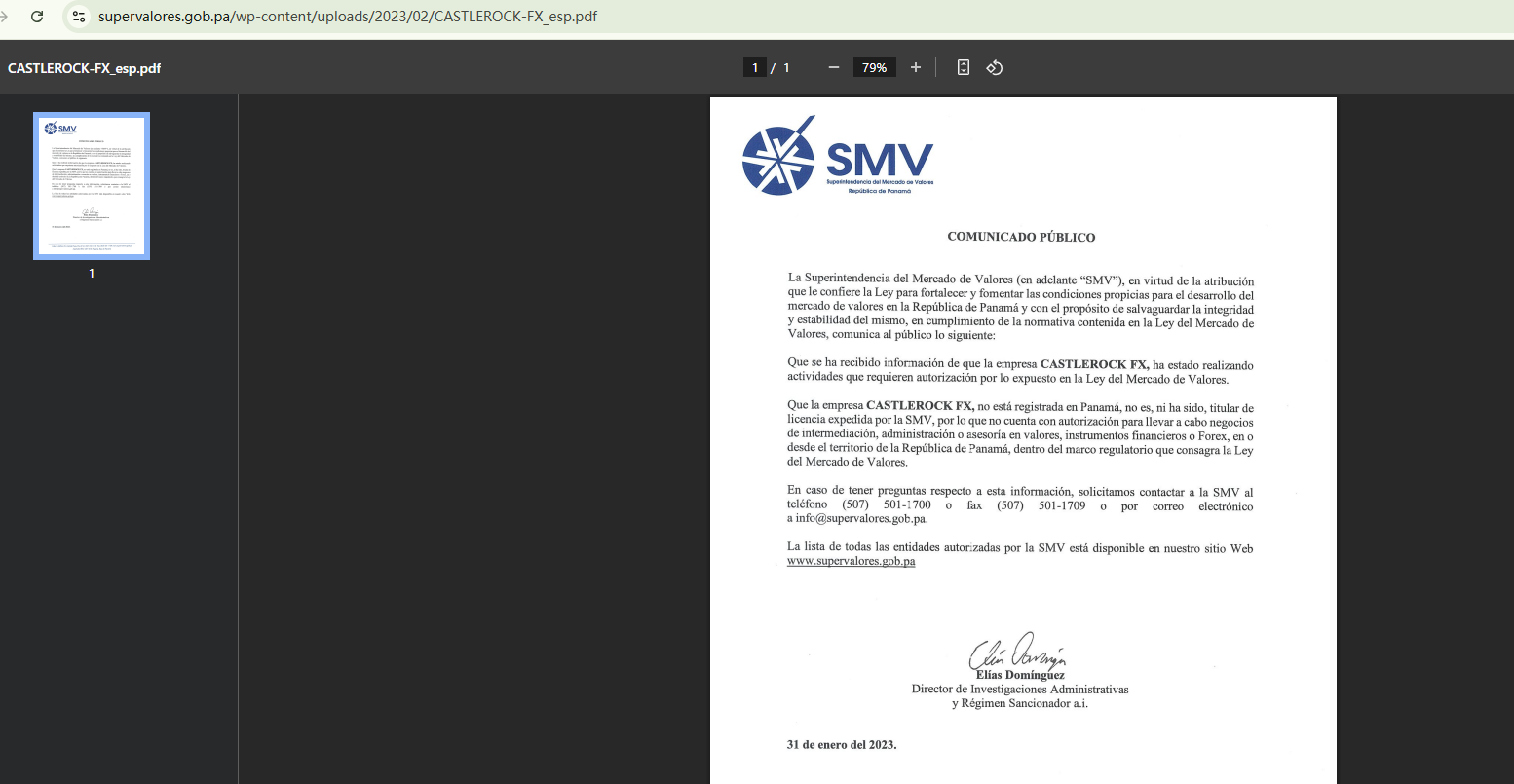 On November 24, 2023, the Superintendencia del Mercado de Valores (SMV) issued a warning against Castle Rock FX for offering financial products or services there without registration. https://supervalores.gob.pa/wp-content/uploads/2023/02/CASTLEROCK-FX_esp.pdf