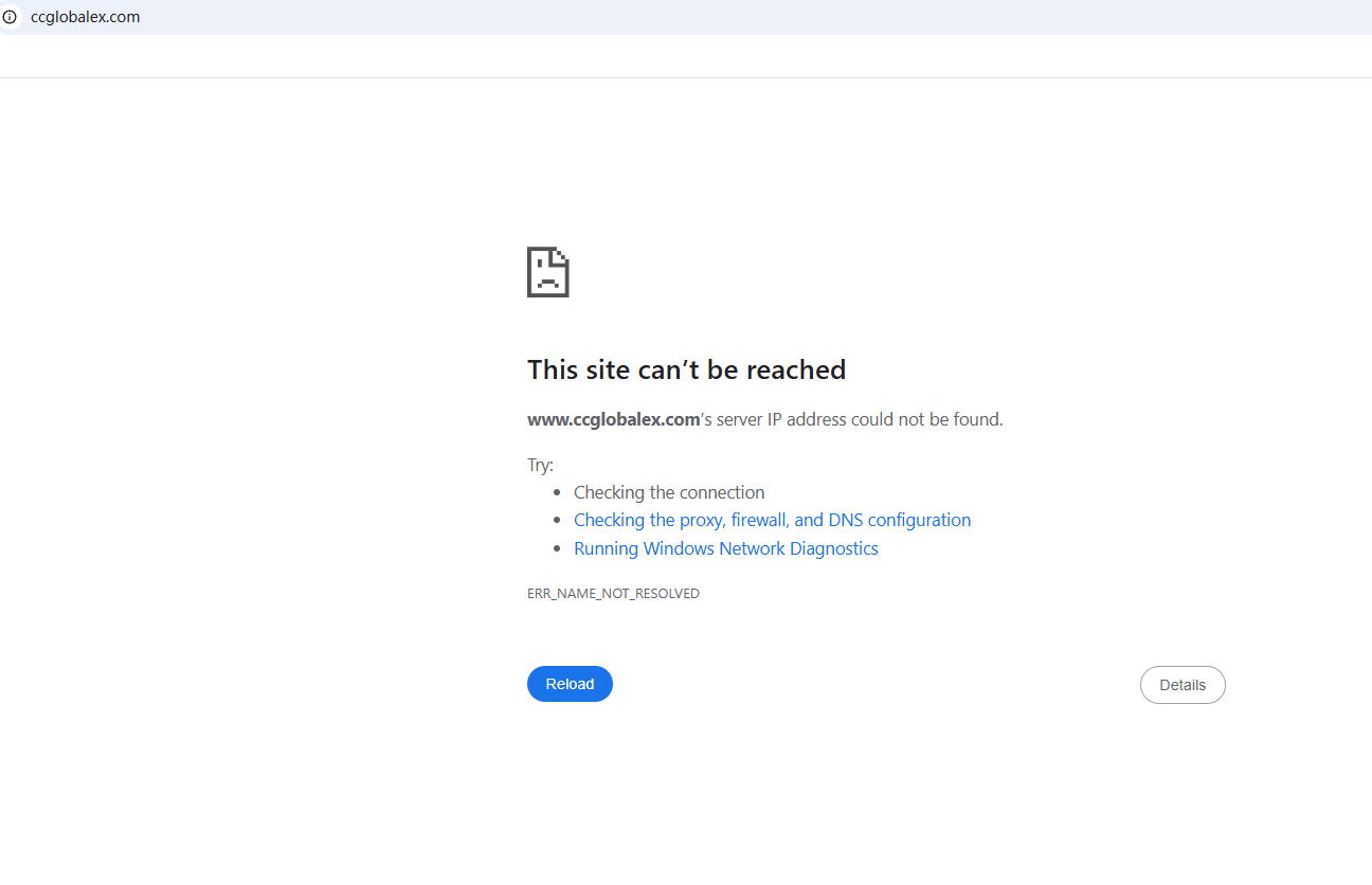 BrokersView found that the domain "https://www.ccglobalex.com/" is currently inaccessible. This is widely regarded as a significant red flag, as the suspension of a broker's website often points to underlying regulatory or operational issues.