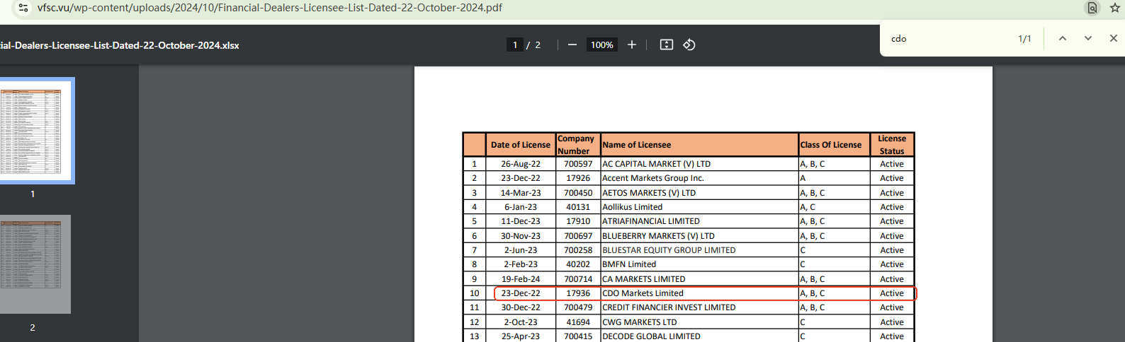 Firstly, the VFSC does not disclose adequate information about license holders, including their associated website addresses. This lack of transparency makes it unclear whether CDO Markets (cdomarkets.com) is genuinely operated by the VFSC licensee. There is a possibility of identity theft, where a shady broker copies information from a legitimate firm to appear credible.