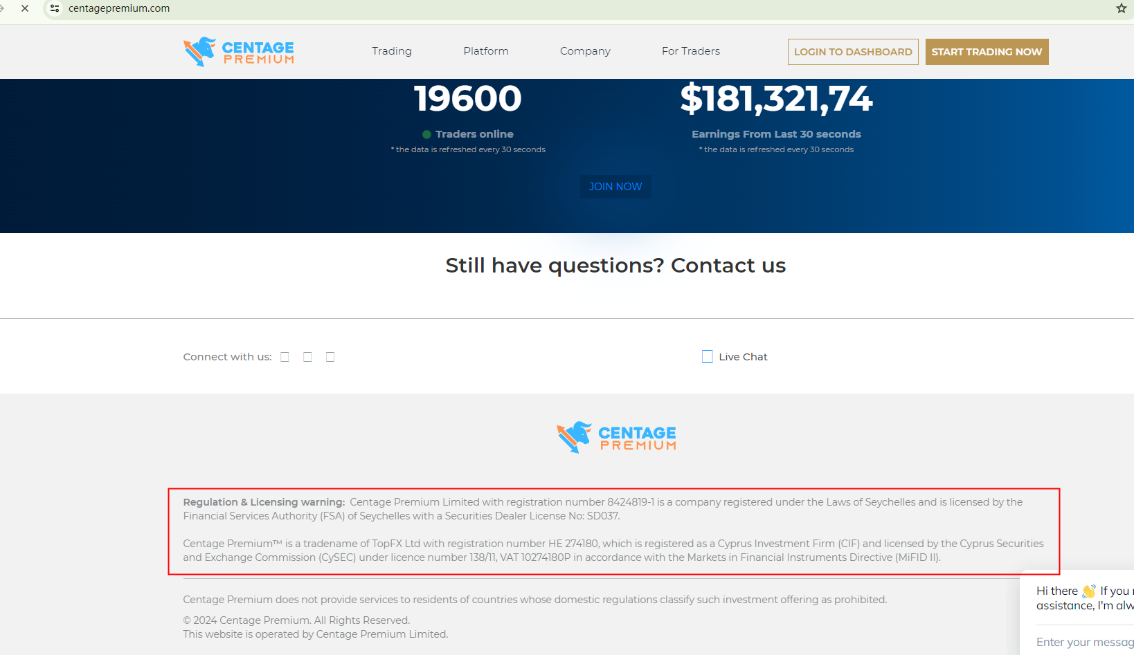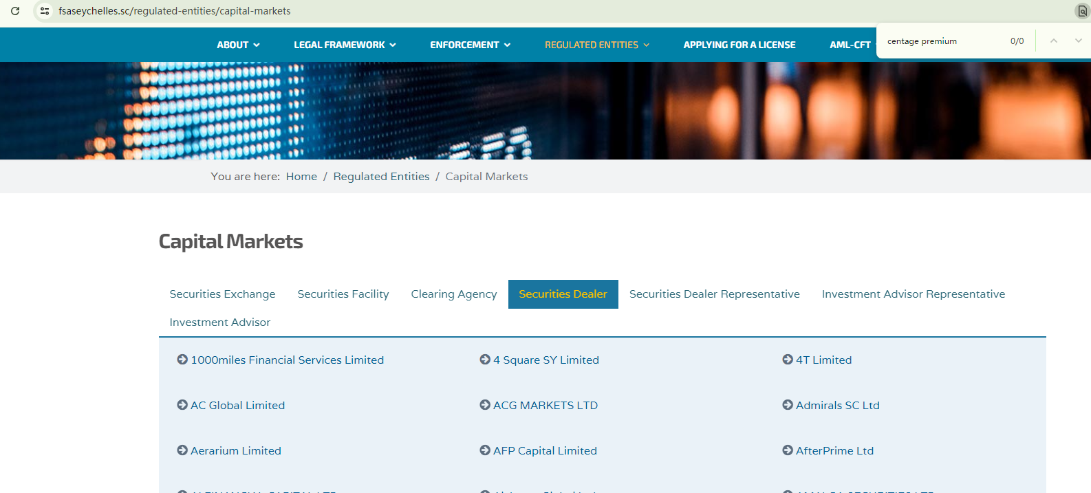 Centage Premium claims to be licensed by the Cyprus Securities and Exchange Commission (CySEC) and Seychelles Financial Services Authority (Seychelles FSA). However, the CySEC has added Centage Premium to its warning list, refuting its claim of being authorized by them. As for the Seychelles FSA authorization claim, there are no matching records from the authority to substantiate it.