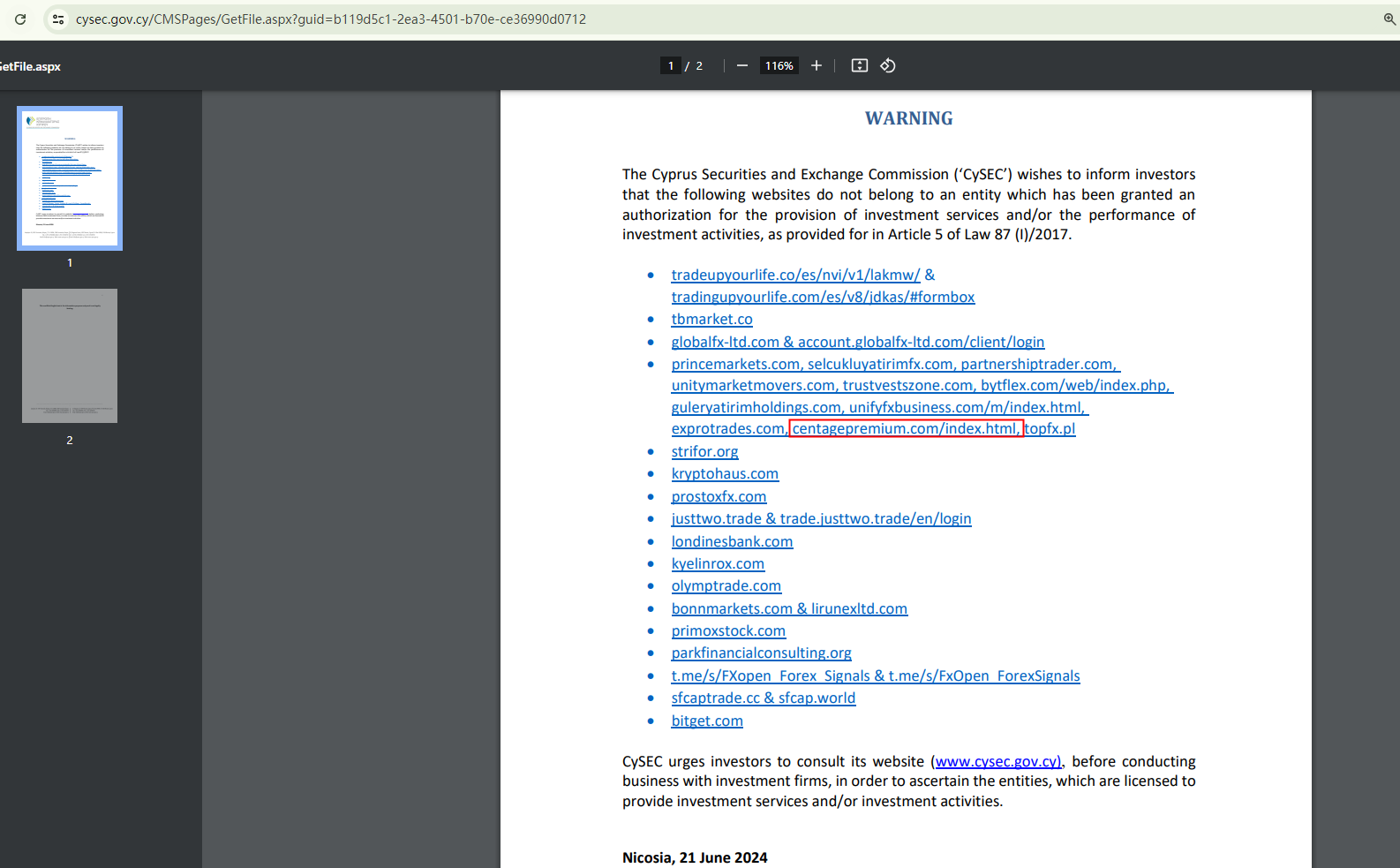 On June 21, 2024, the Cyprus Securities and Exchange Commission (CySEC) added Centage Premium to its warning list, stating it does not belong to an entity which has been granted an authorization for the provision of investment services and/or the performance of investment activities. https://www.cysec.gov.cy/CMSPages/GetFile.aspx?guid=b119d5c1-2ea3-4501-b70e-ce36990d0712