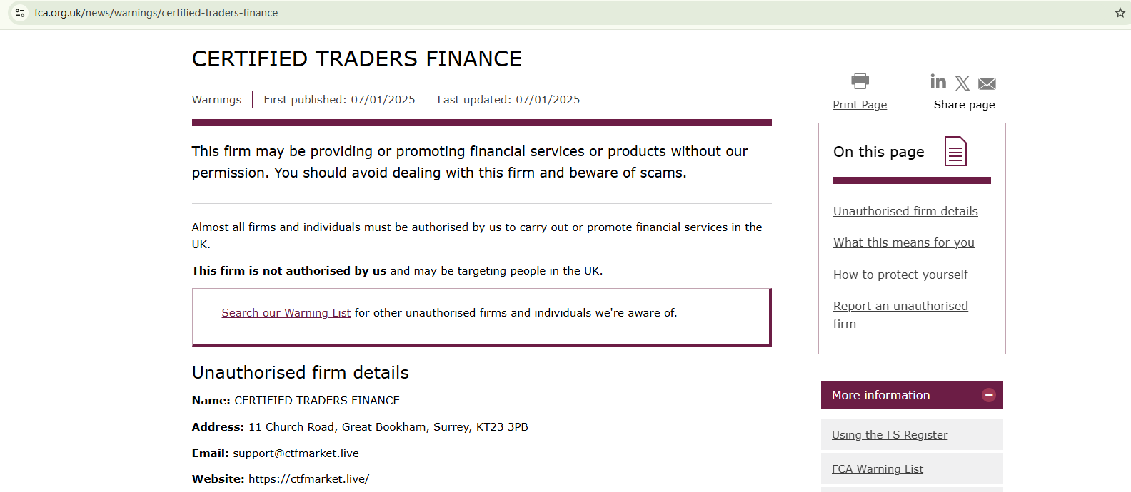 On January 7, 2025, the Financial Conduct Authority (FCA) issued a warning against CERTIFIED TRADERS FINANCE, believing this company might be providing financial services or products without proper authorization in the UK. https://www.fca.org.uk/news/warnings/certified-traders-finance