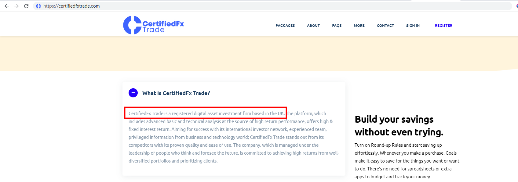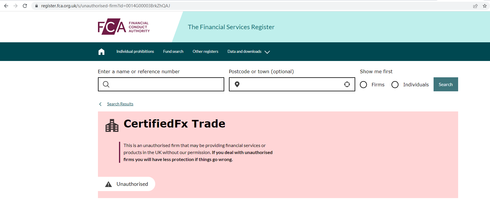 CertifiedFx Trade claims to be a registered digital asset investment firm based in the UK. We searched the U.K Financial Conduct Authority (FCA) and found a matching result. But it is unauthorised. The truth is that CertifiedFx Trade is not under valid regulation by any regulators to do forex. Investors' funds in this broker are unsafe and cannot be protected by any law.