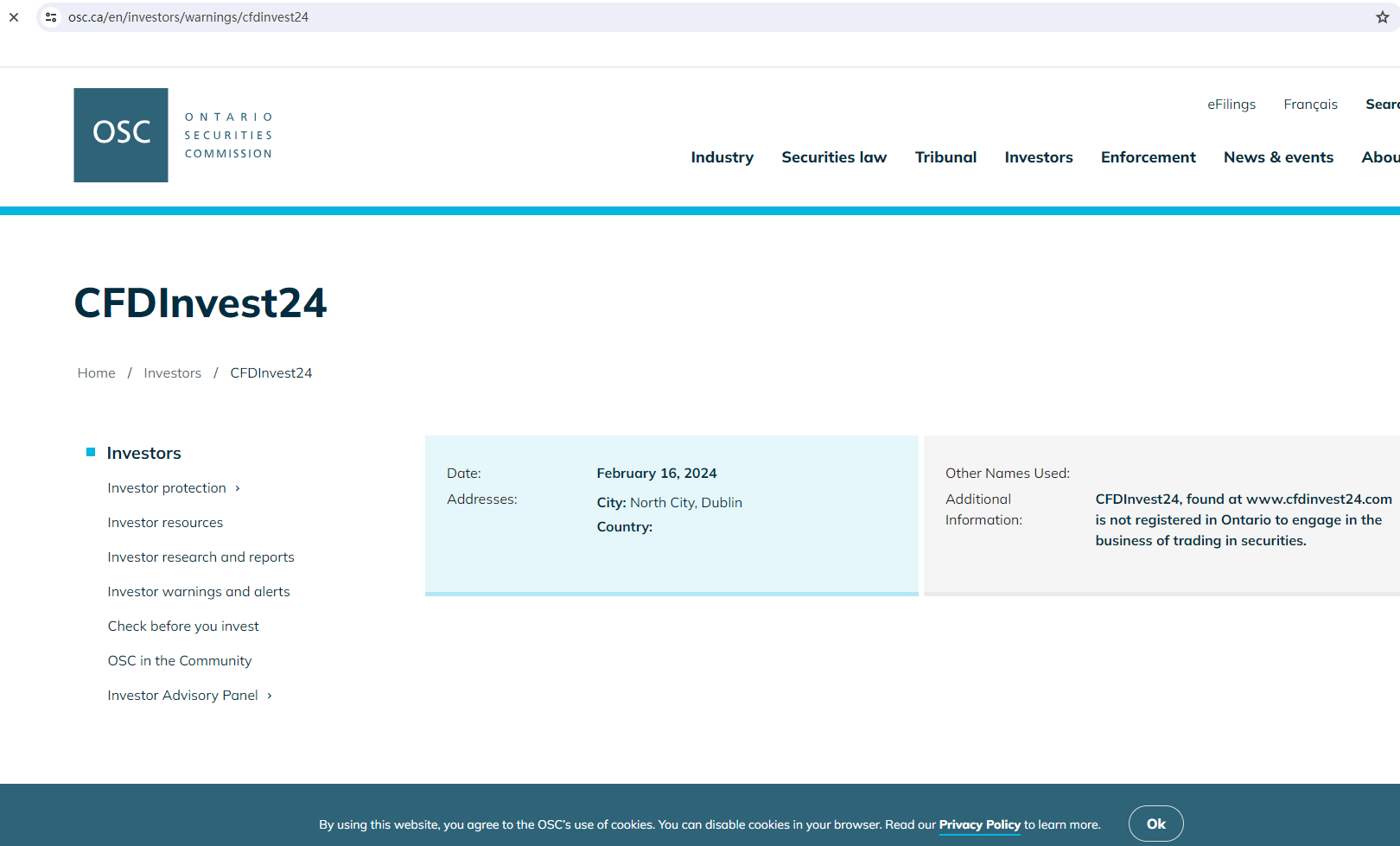 In addition, the Ontario Securities Commission (OSC) issued a warning that Cfdinvest24 was providing financial services or products without authorisation.