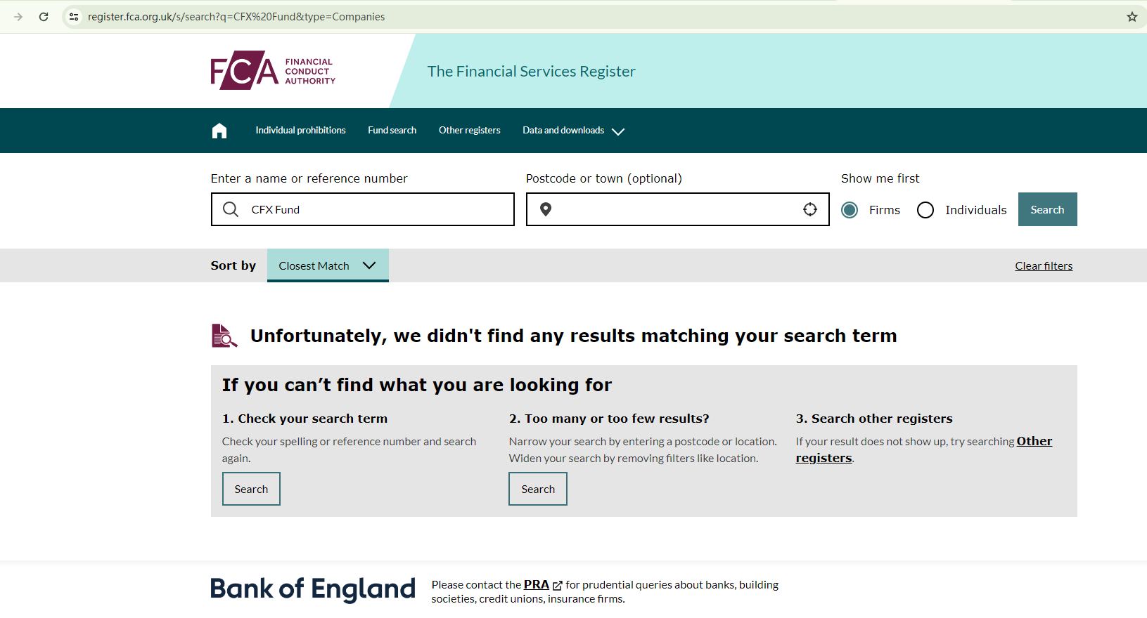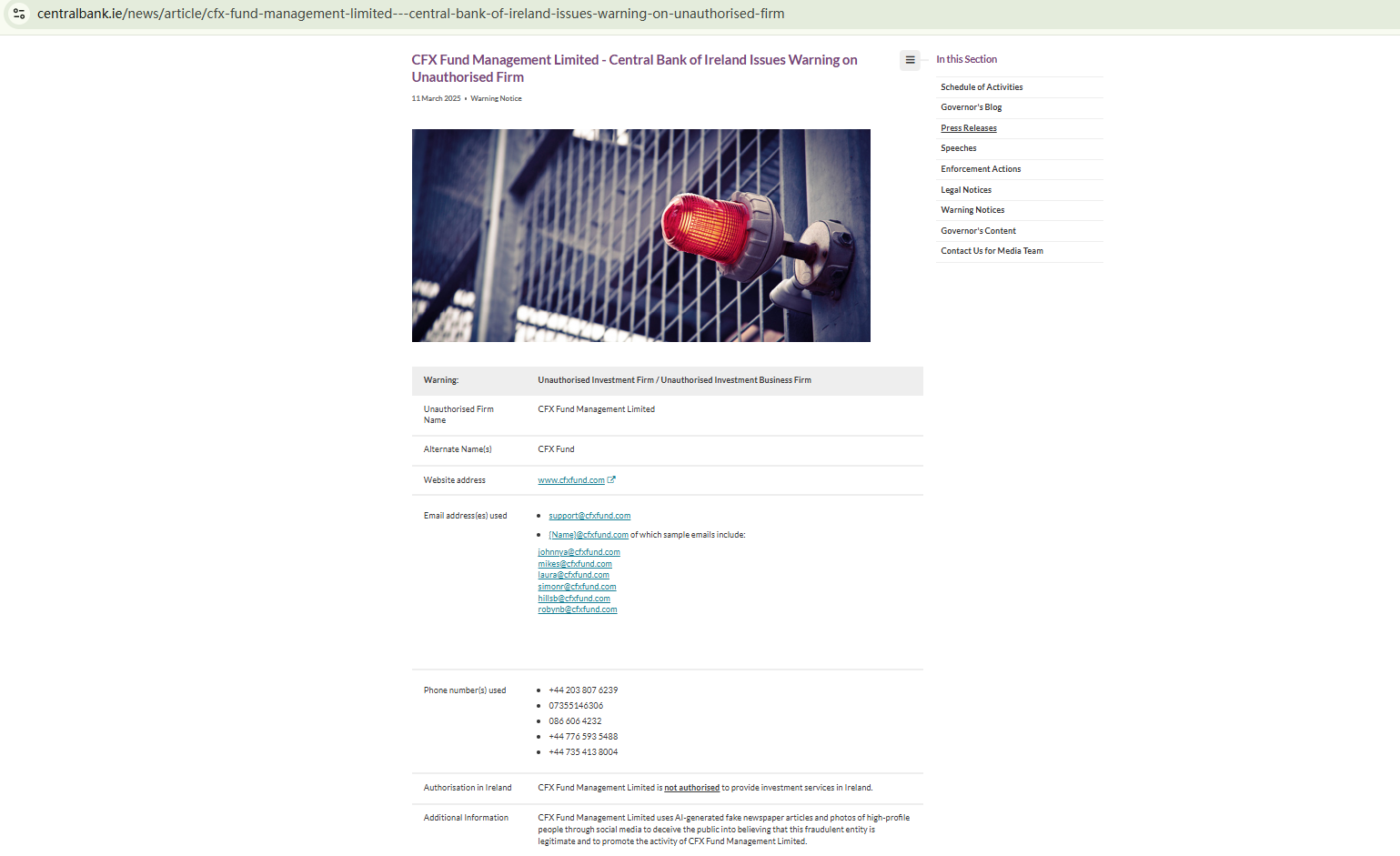 On March 11, 2025, the Central Bank of Ireland (CBI) issued a warning about CFX Fund, noting that the firm is not authorized there. https://www.centralbank.ie/news/article/cfx-fund-management-limited---central-bank-of-ireland-issues-warning-on-unauthorised-firm