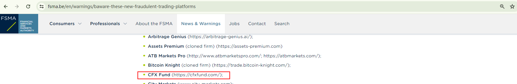 In addition, the Belgian Financial Services and Markets Authority (FSMA) has added CFX Fund to its warning list as a fraudulent trading platform.