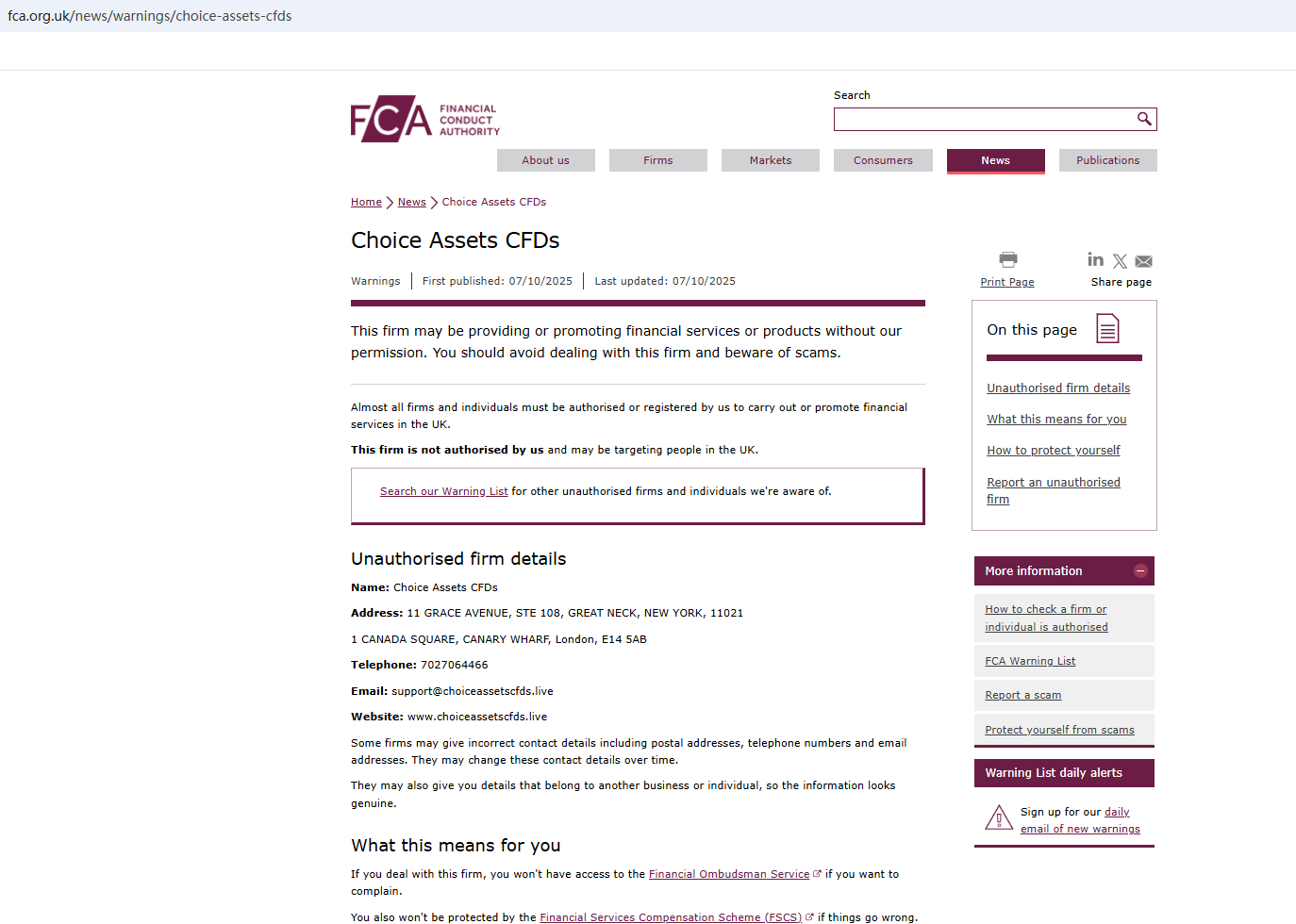 On Oct 7, 2025, the Financial Conduct Authority (FCA) issued a warning regarding Choice Assets CFDs, suspecting that this company may be offering financial services or products without the necessary authorization. https://www.fca.org.uk/news/warnings/choice-assets-cfds