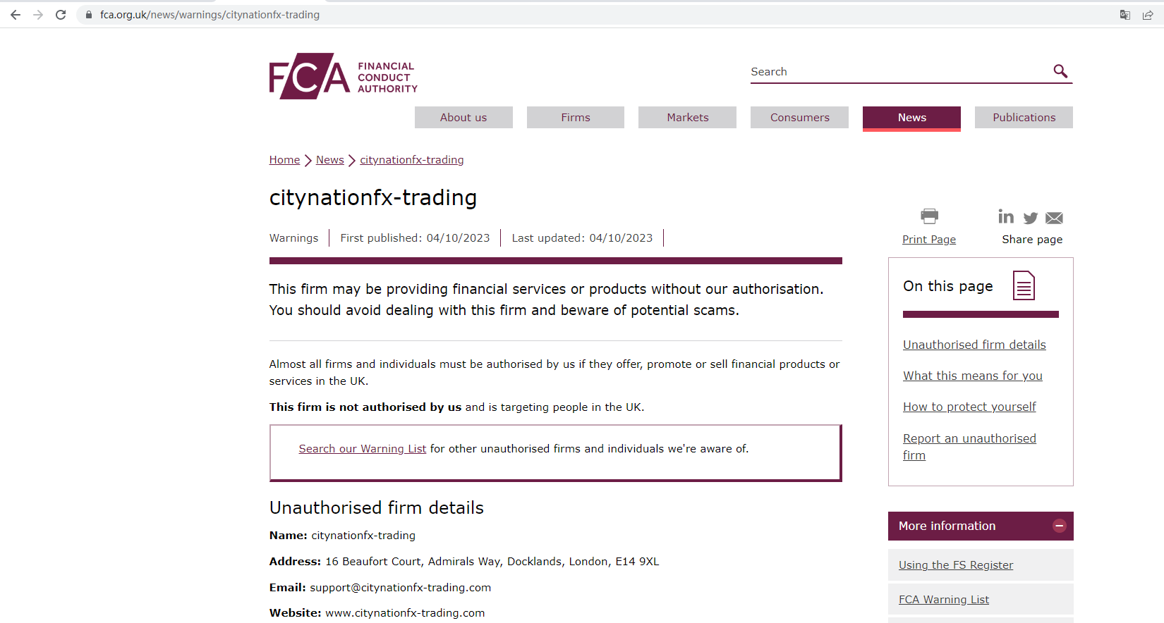 The United Kingdom Financial Conduct Authority (UK FCA) issued a warning that citynationfx trading was providing finacial services or products without authorisation.