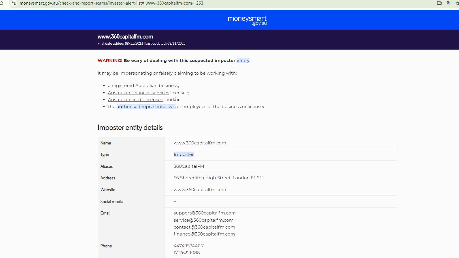 The Australian Securities and Investments Commission (ASIC) warned that the website 360capitalfm.com is impersonating and falsely claiming to be working with an Australian financial services licensee. https://moneysmart.gov.au/check-and-report-scams/investor-alert-list#!www-360capitalfm-com-1263
