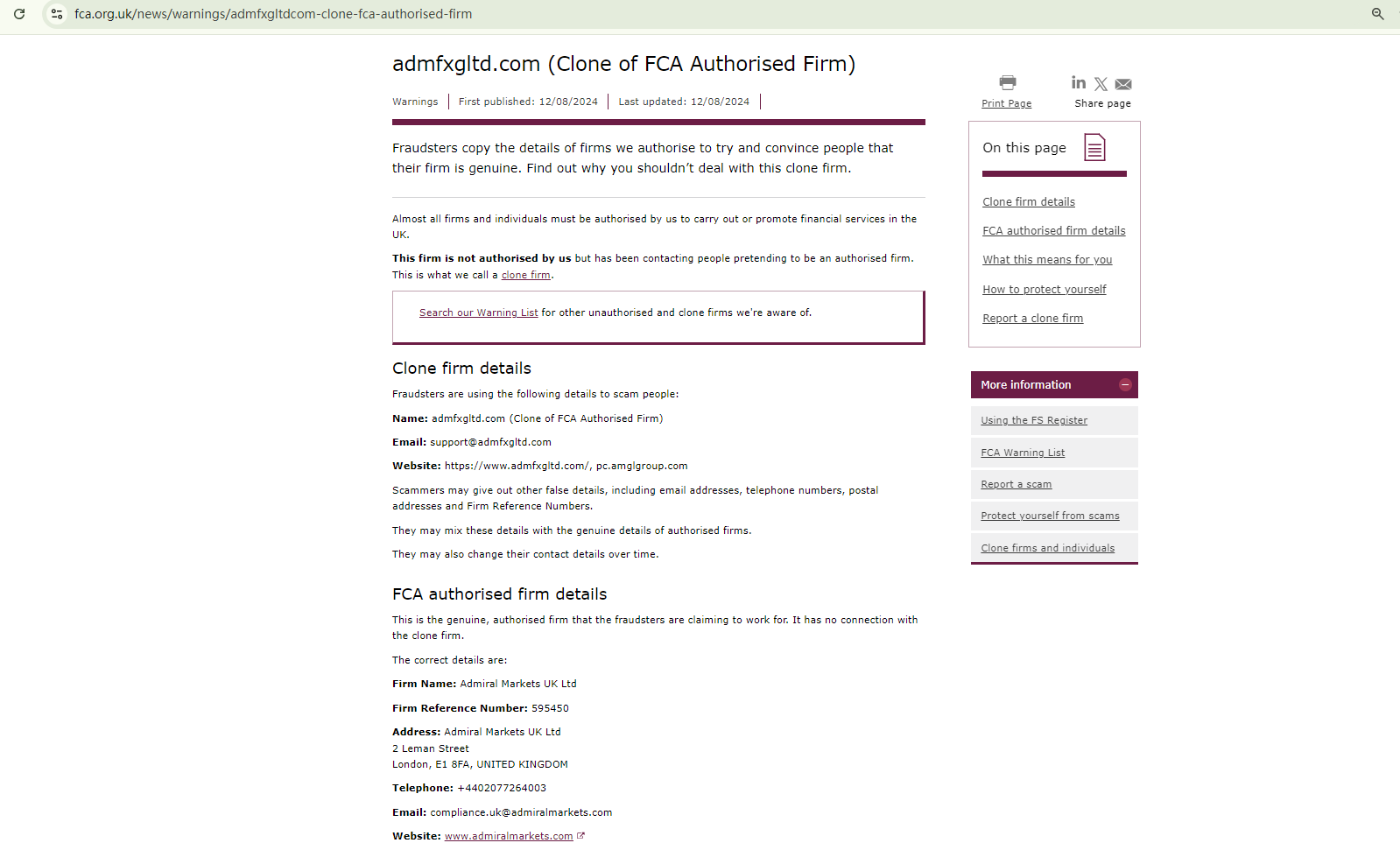 On August 12, 2024, the Financial Conduct Authority (FCA) issued a warning against admfxgltd.com, identifying it as a clone of an FCA-authorized firm. https://www.fca.org.uk/news/warnings/admfxgltdcom-clone-fca-authorised-firm