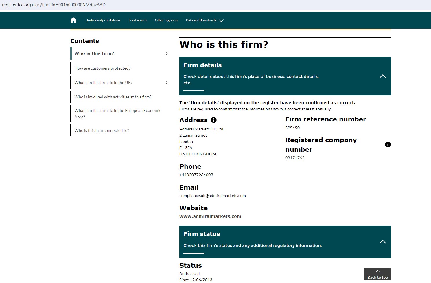 We indeed found a match result to Admiral Markets UK Ltd. But as per the regulatory details shown on FCA, the only approved domain of this licensed firm is "https://www.admiralmarkets.com/" instead of the one used by Admrlmrkts.co. That means Admrlmrkts.co is high possibly a clone firm that falsely uses the regulatory information of an FCA-licensed firm.