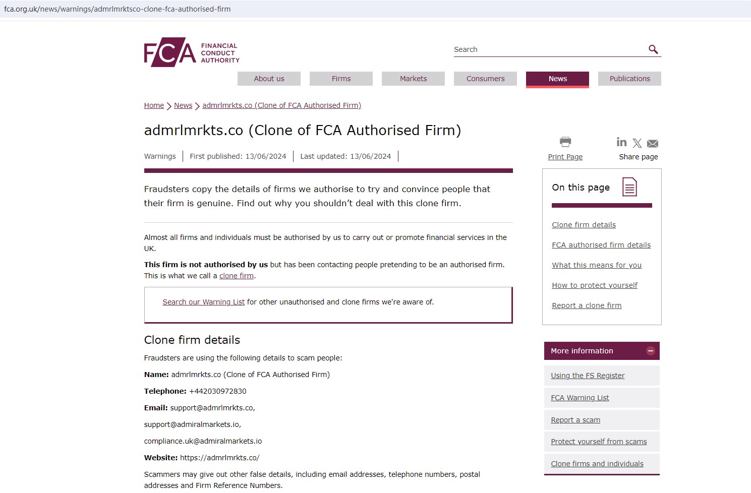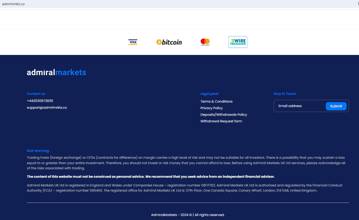 And the United Kingdom Financial Conduct Authority (FCA) have issued a warning against admrlmrkts.co, which is clone firm of AdmiralMarkets and provides financial services or products without authorisation in the UK.
