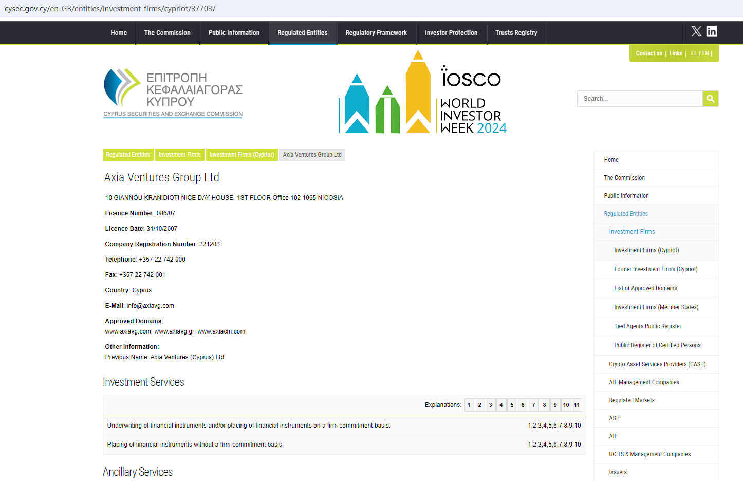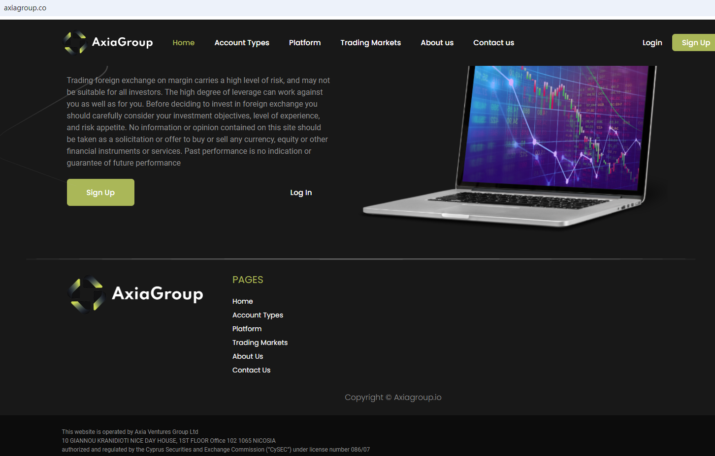 Axiagroup.co claims to be operated by Axia Ventures Group Ltd authorized and regulated by the Cyprus Securities and Exchange Commission (CySEC) under license number 086/07, offering a range of investment products to traders, including Forex, Indices, Commodities, Stocks, Cryptocurrencies and more instruments for trading in global markets.