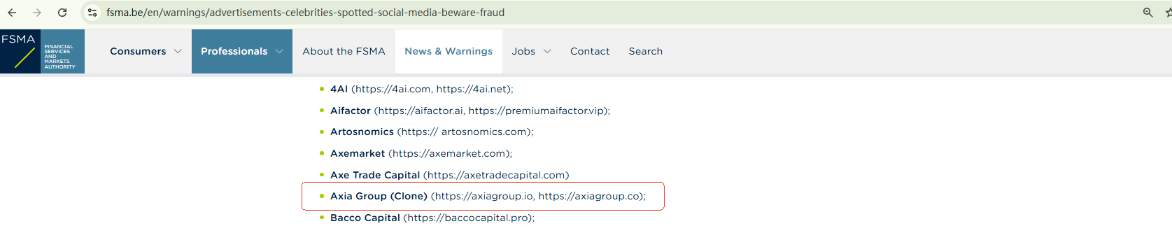 On November 15, 2024, the Belgian Financial Services and Markets Authority (FSMA) added Clone AxiaGroup to its warning list as a fraudulent trading platform operating in the Belgian market and advised investors to stay away from it. https://www.fsma.be/en/warnings/advertisements-celebrities-spotted-social-media-beware-fraud