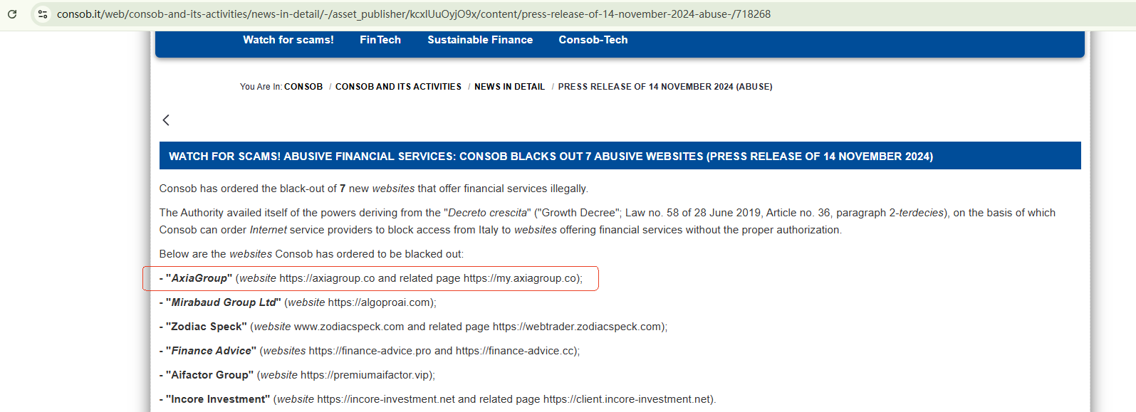 On November 14, 2024, the Italian Companies and Exchange Commission (CONSOB) ordered axiagroup.co to be blacked out since it offers financial services illegally in Italy. https://www.consob.it/web/consob-and-its-activities/news-in-detail/-/asset_publisher/kcxlUuOyjO9x/content/press-release-of-14-november-2024-abuse-/718268