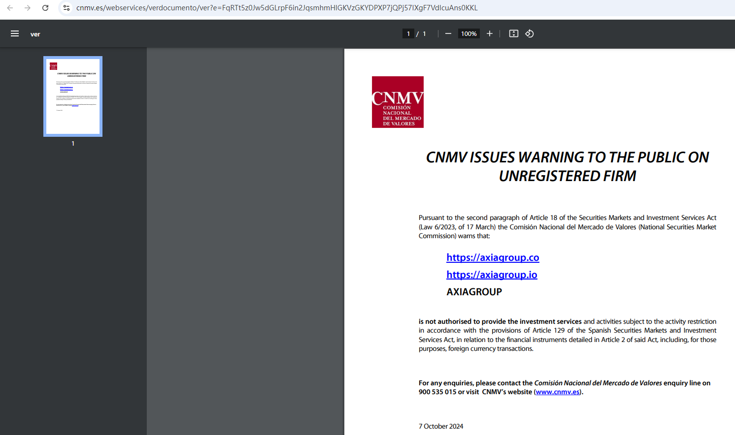 On October 7th, 2024, the Comisión Nacional del Mercado de Valores (CNMV) added AXIAGROUP to its warning list for providing investment services without authorization. https://www.cnmv.es/webservices/verdocumento/ver?e=FqRTt5z0Jw5dGLrpF6in2JqsmhmHlGKVzGKYDPXP7jQPj57IXgF7VdIcuAns0KKL.