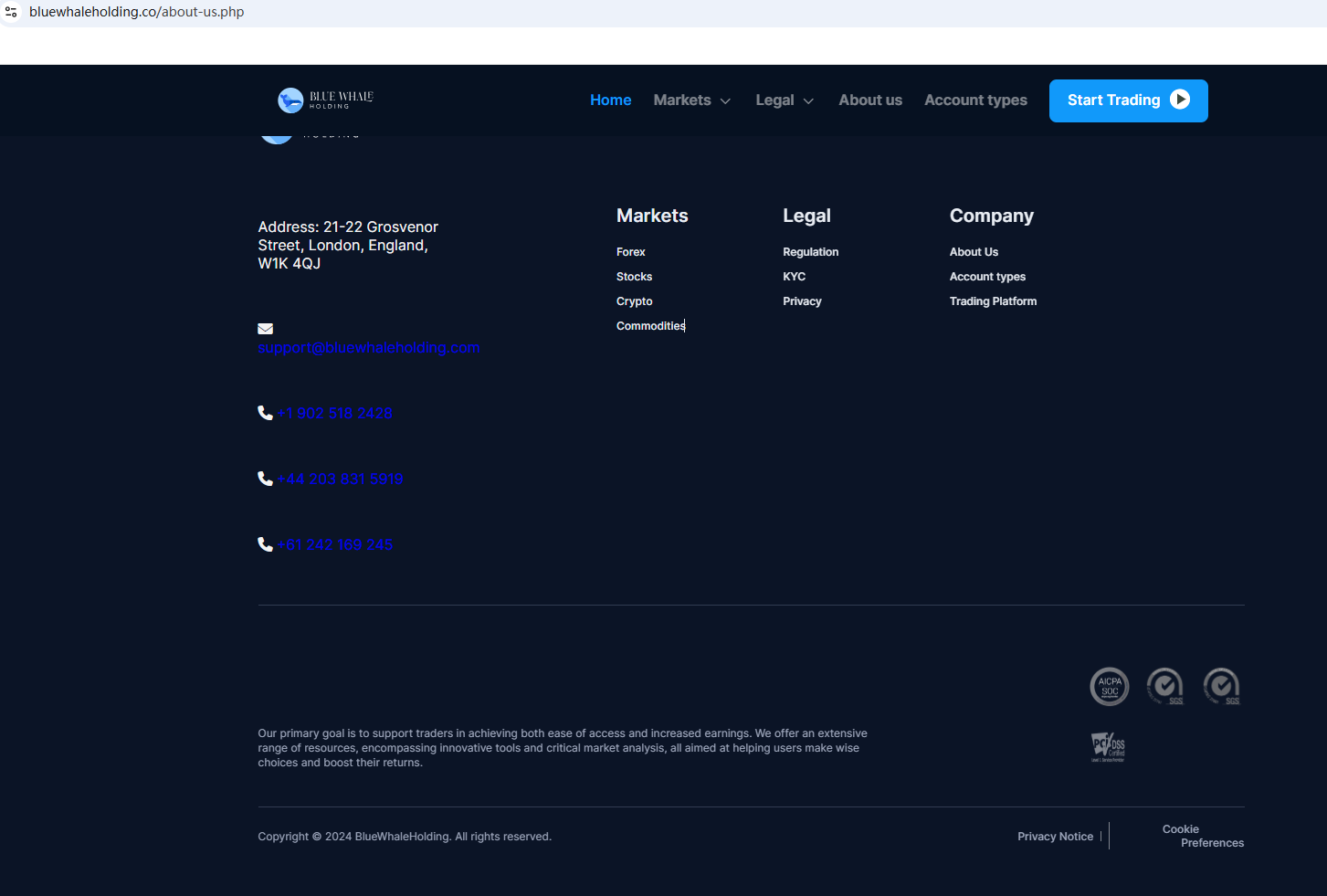 According to its website, it is located in the UK. Upon investigation, we found that the Financial Conduct Authority (FCA) issued a warning against bluewhaleholding.co, identifying this company as a clone of an FCA-authorized firm.