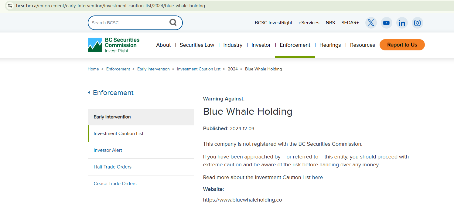 On December 9, 2024, the British Columbia Securities Commission (BCSC) issued a warning against bluewhaleholding.co, stating that this broker is not registered to trade in, or advise on, securities or derivatives in BC. https://www.bcsc.bc.ca/enforcement/early-intervention/investment-caution-list/2024/blue-whale-holding