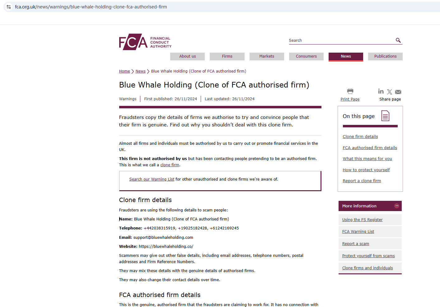 On November 26, 2024, the Financial Conduct Authority (FCA) issued a warning against bluewhaleholding.co, identifying this company as a clone of an FCA-authorized firm. https://www.fca.org.uk/news/warnings/blue-whale-holding-clone-fca-authorised-firm