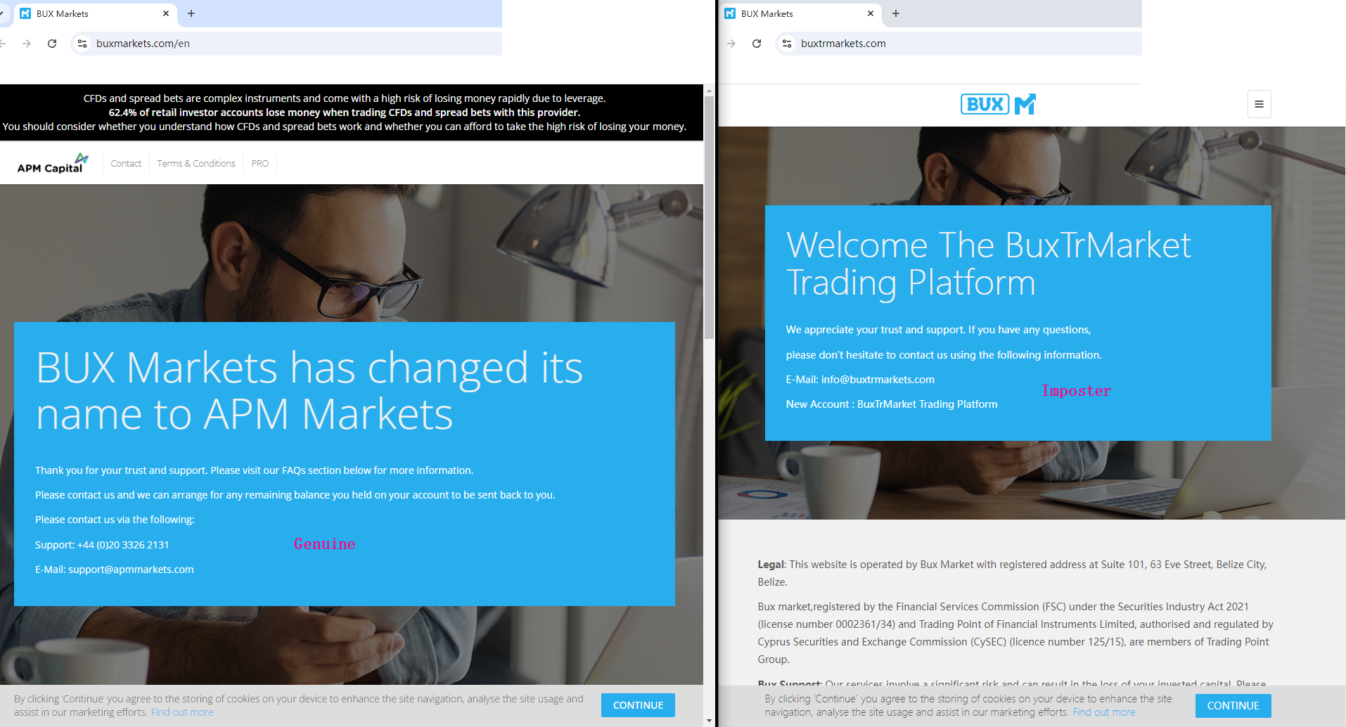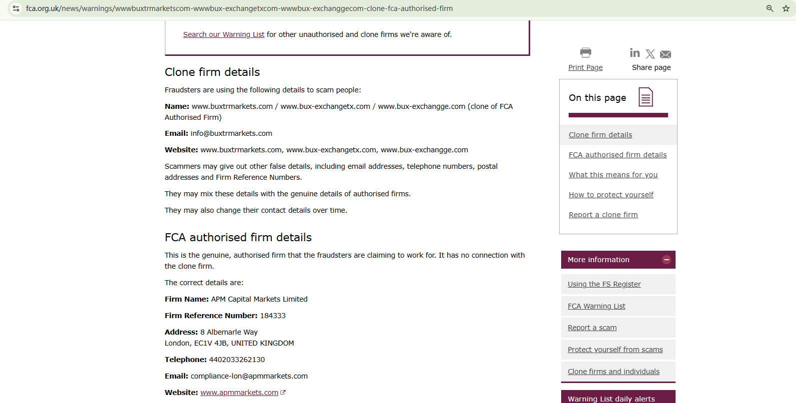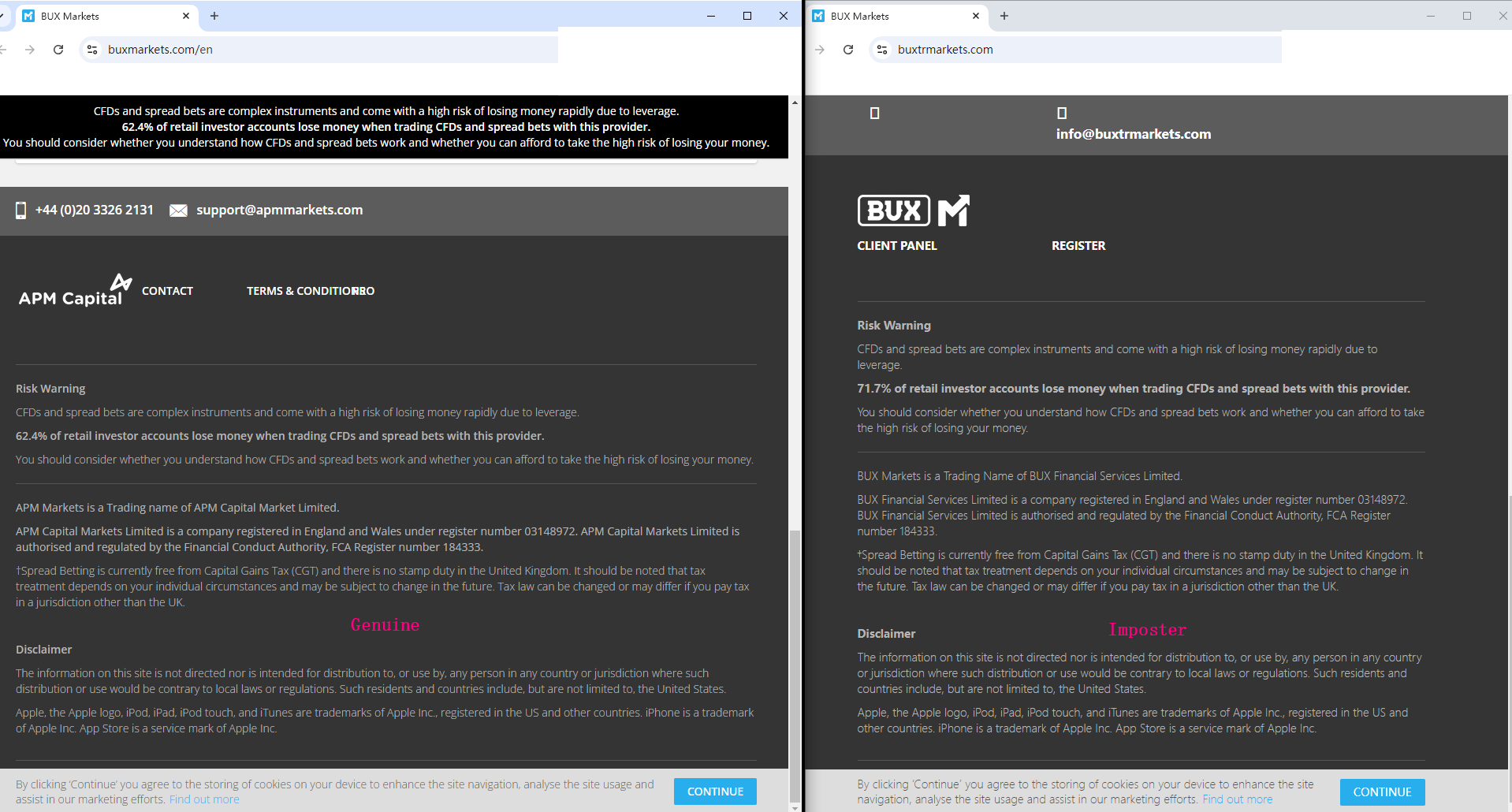 buxtrmarkets.com and bux-exchangetx.com falsely claim to be operated by APM Capital Markets Limited, an FCA-authorized company. In fact, fraudulent company has no connection with the compliant company. A careful comparison of the two websites shows that the fraudulent company even directly copied important information such as the compliant company's website design, regulatory certificates, etc. Moreover, the website buxtrmarkets.com is flagged by the Financial Conduct Authority (FCA) for providing financial services or products in the UK without authorization.