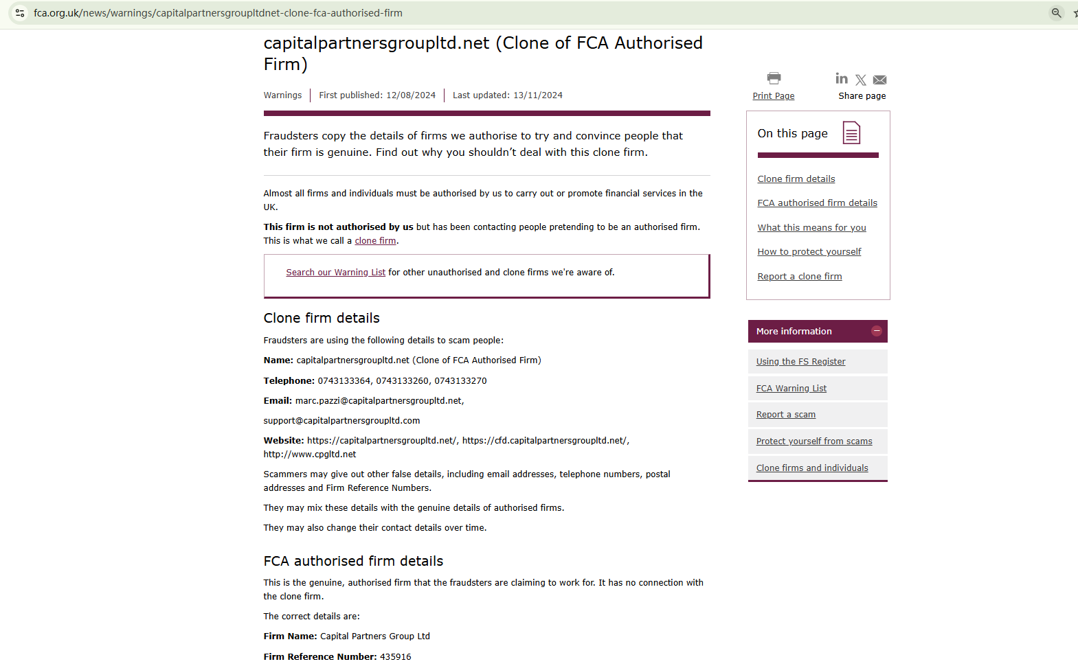On November 13, 2024, the Financial Conduct Authority (FCA) has labeled firm as a clone, which operates three websites, capitalpartnersgroupltd.net, cfd.capitalpartnersgroupltd.net, and cpgltd.net. The first two websites are currently disabled. https://www.fca.org.uk/news/warnings/capitalpartnersgroupltdnet-clone-fca-authorised-firm
