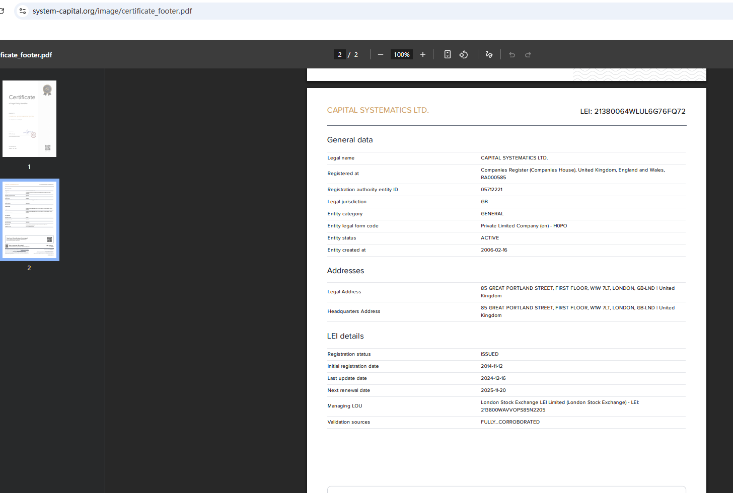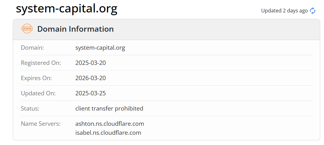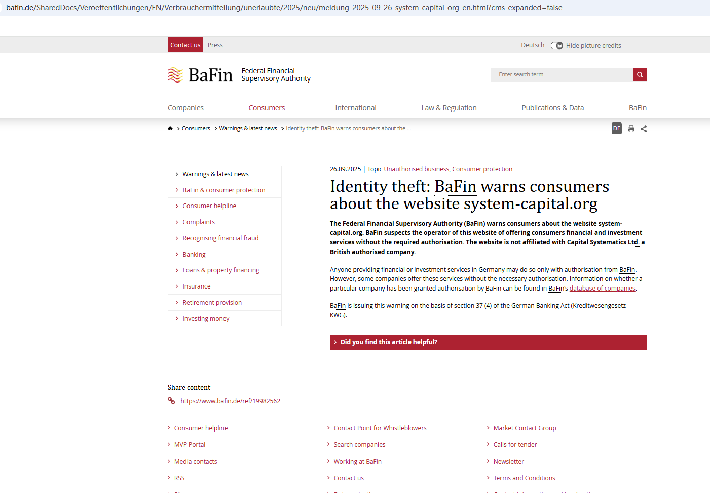 On Sept 26, 2025, the Federal Financial Supervisory Authority (BaFin) issued a warning against system-capital.org for the lack of the required authorization. https://www.bafin.de/SharedDocs/Veroeffentlichungen/EN/Verbrauchermitteilung/unerlaubte/2025/neu/meldung_2025_09_26_system_capital_org_en.html?cms_expanded=false