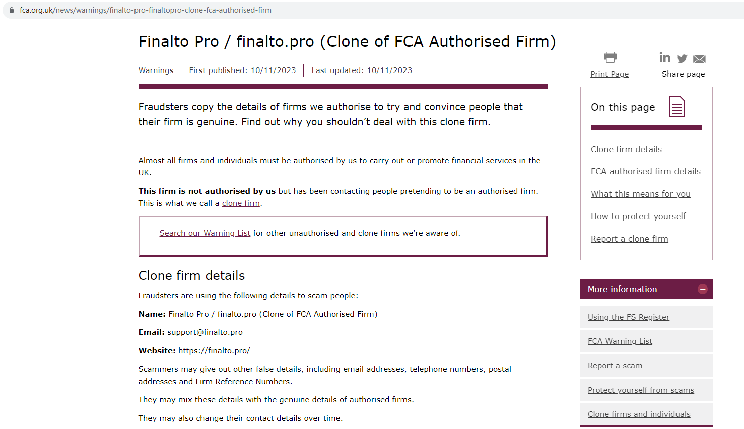 The United Kingdom Financial Conduct Authority (UK FCA) issued a warning that Clone Finalto Pro was a clone of FCA Authorised firm, Finalto Financial Services Limited.