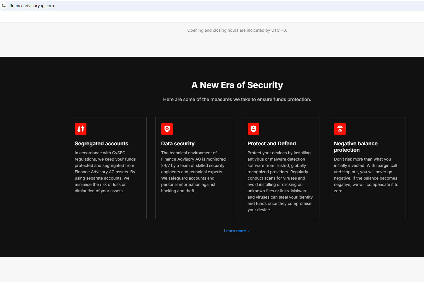 BrokersView found that the domain "financeadvisoryag.com" are currently inaccessible. This is widely regarded as a significant red flag, as the suspension of a broker's website often points to underlying regulatory or operational issues.