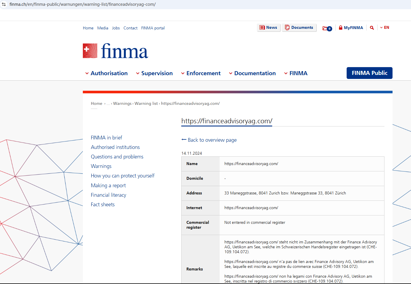 On November 14, 2024, the Swiss Financial Market Supervisory Authority (FINMA) issued a warning against financeadvisoryag.com, stating that this broker is not entered in its commercial register. https://www.finma.ch/en/finma-public/warnungen/warning-list/financeadvisoryag-com/