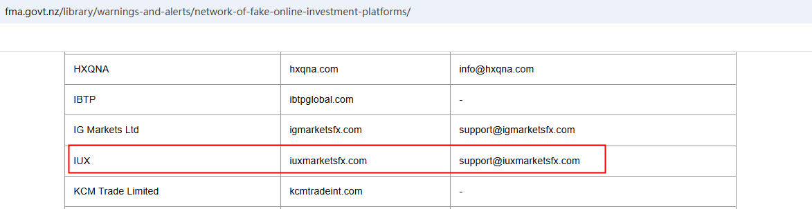 On February 17, 2025, the New Zealand Financial Markets Authority (NZ FMA) released a warning list, advising investors to stay vigilant about 96 suspicious investment websites including iuxmarketsfx.com. https://www.fma.govt.nz/library/warnings-and-alerts/network-of-fake-online-investment-platforms/