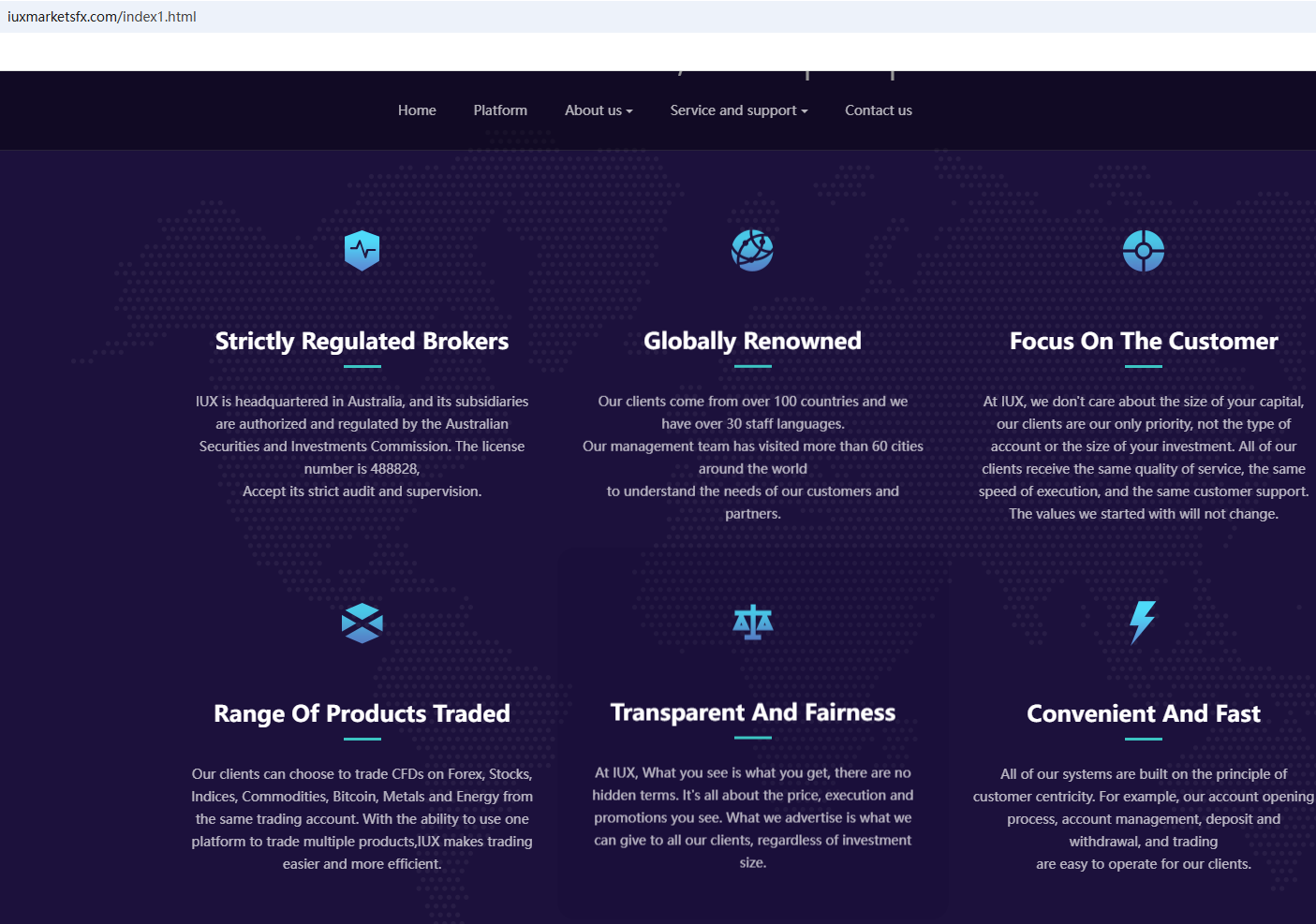 The website iuxmarketsfx.com is involved in identity theft. Firstly, it misuses the logo of a genuine broker, IUX, to appear real. Secondly, it copies the licensing information of Star Funds Management Pty Ltd to create the illusion of being authorized by the Australian Securities and Investments Commission (ASIC). In fact, neither IUX nor the ASIC licensee bears any responsiblity for iuxmarketsfx.com. The New Zealand Financial Markets Authority (NZ FMA) has blacklisted the website iuxmarketsfx.com for fraudulent activities. Therefore, iuxmarketsfx.com is a scam.