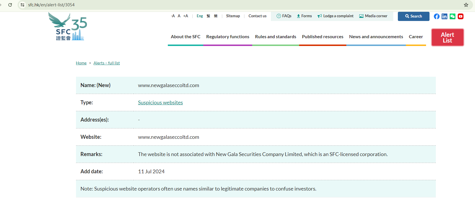 On July 11, 2024, the Hong Kong Securities and Futures Commission (HK SFC) flagged newgalaseccoltd.com as a suspicious website. The commission also underscores that the website is not associated with New Gala Securities Company Limited, which is an SFC-licensed corporation. https://www.sfc.hk/en/alert-list/3054