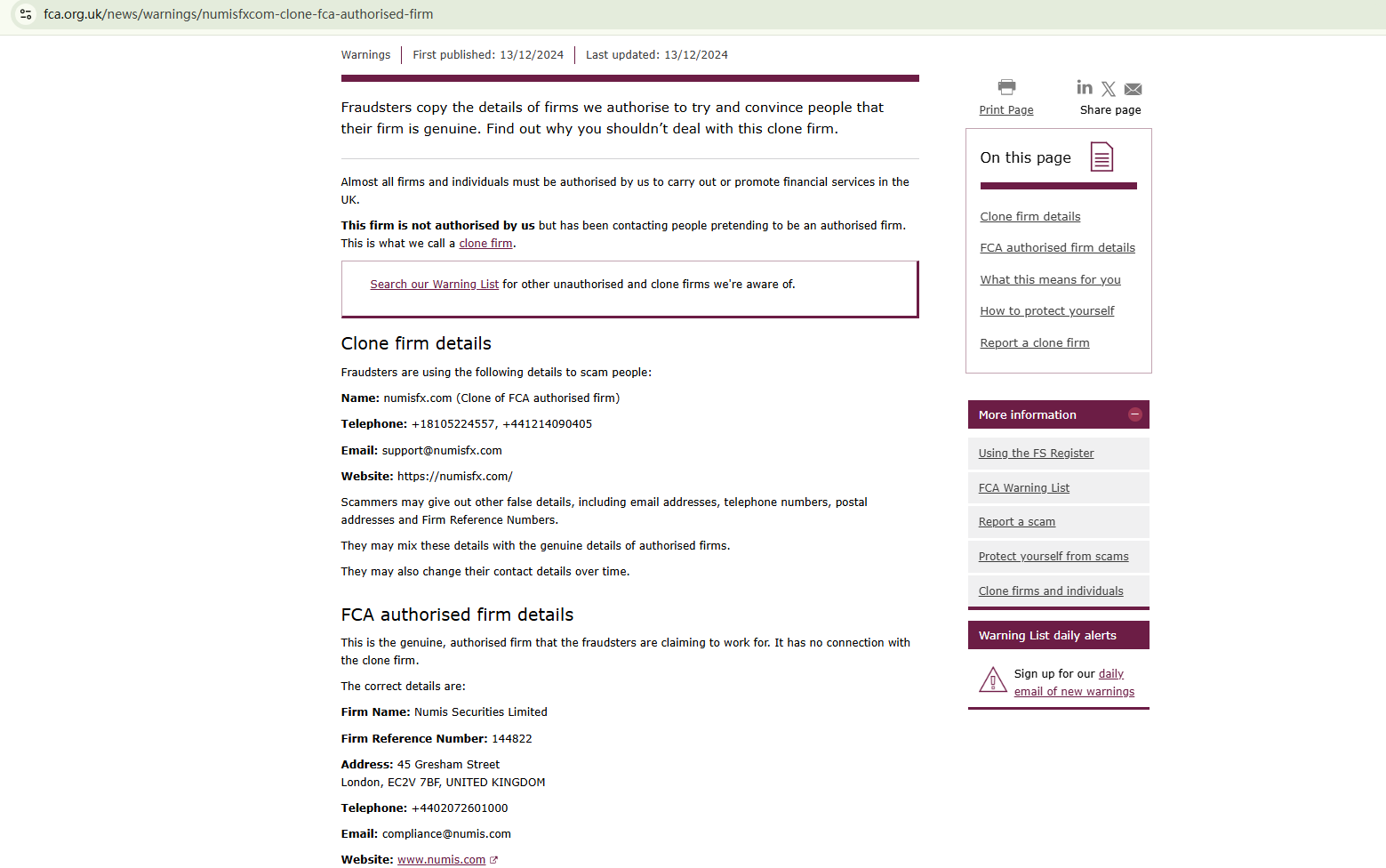On December 13, 2024, the Financial Conduct Authority (FCA) issued a warning against numisfx.com, identifying it as a clone of an FCA-authorized firm. https://www.fca.org.uk/news/warnings/numisfxcom-clone-fca-authorised-firm