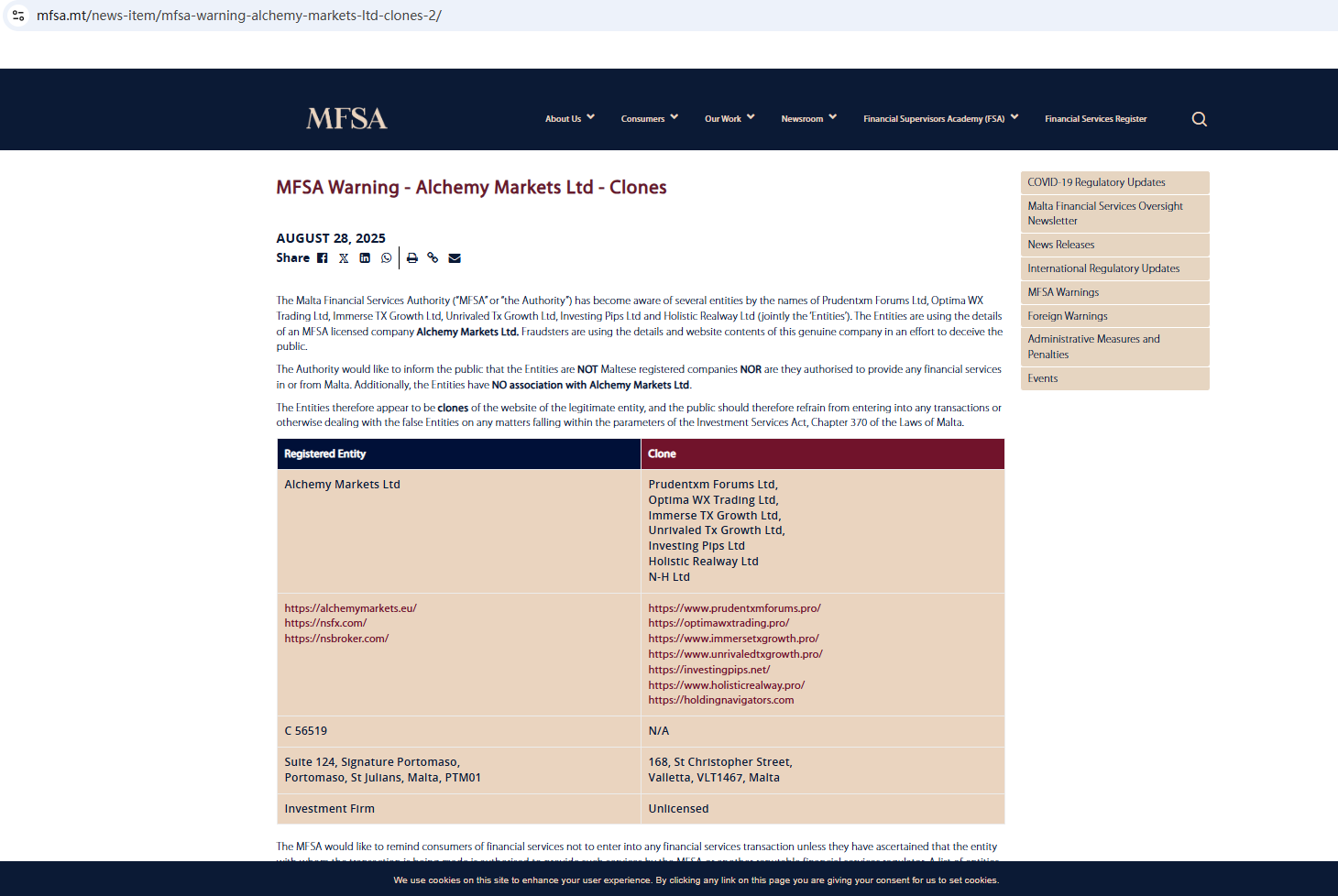 optimawxtrading.pro claims to be regulated by the Malta Financial Services Authority (MFSA). However, our investigation revealed that optimawxtrading.pro copies content and design from legitimate brokers such as NSBroker, and the MFSA has publicly warned about related unlicensed activities. This clear misuse of information is a strong indicator that optimawxtrading.pro is operating a scam.