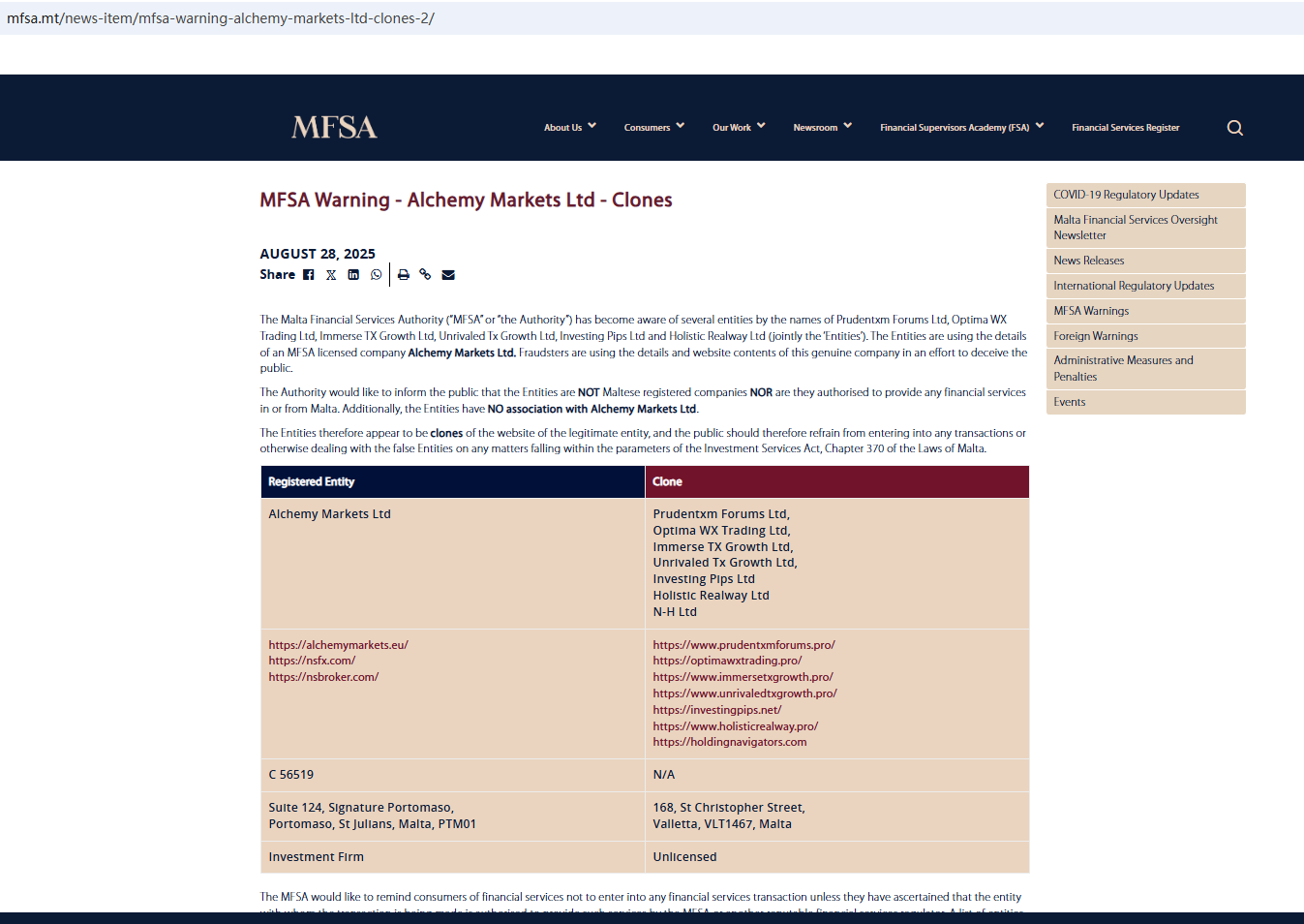 On Aug 28, 2025, the Malta Financial Services Authority (MFSA) issued a warning against prudentxmforums.pro for providing investment services without licenses. https://www.mfsa.mt/news-item/mfsa-warning-alchemy-markets-ltd-clones-2/