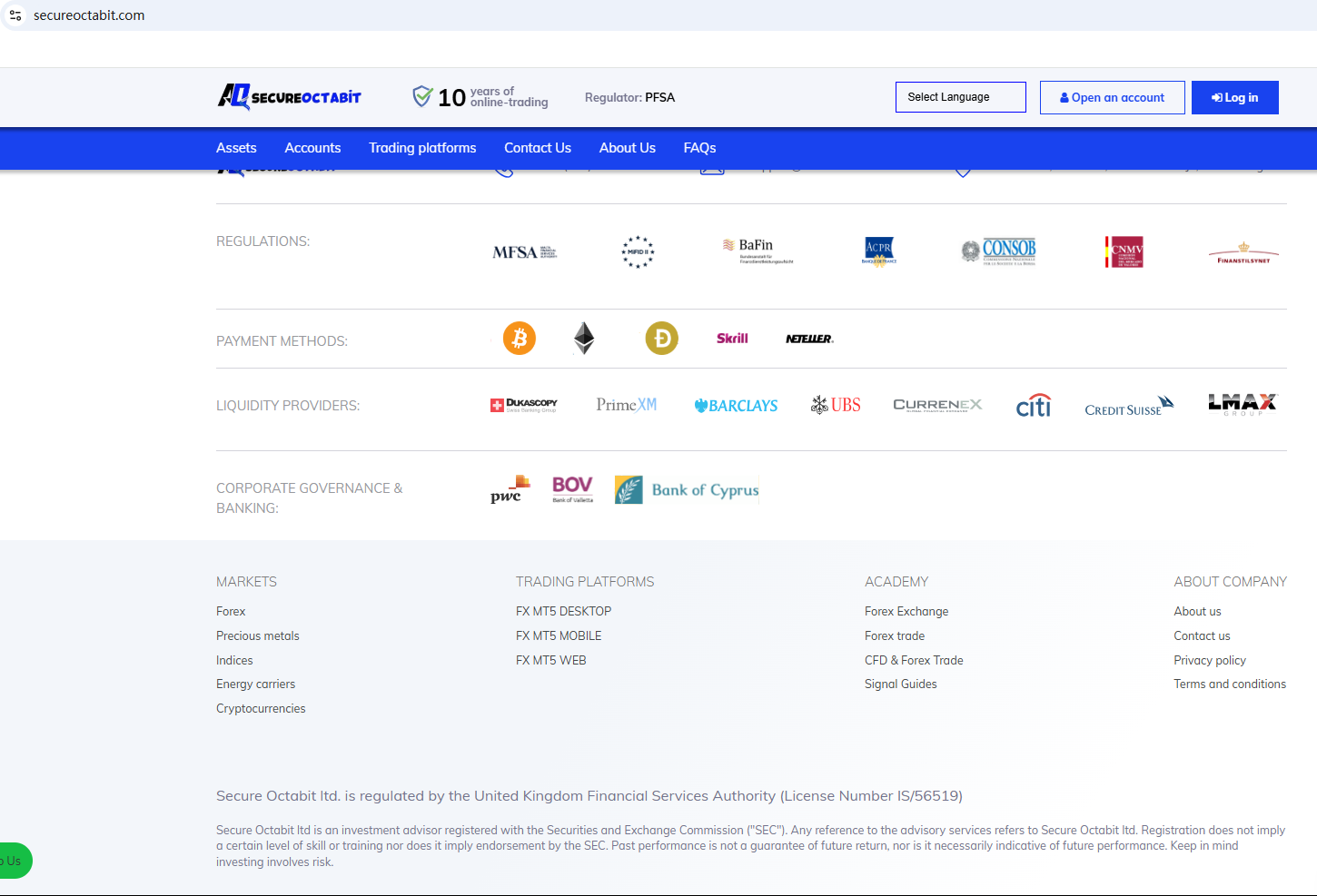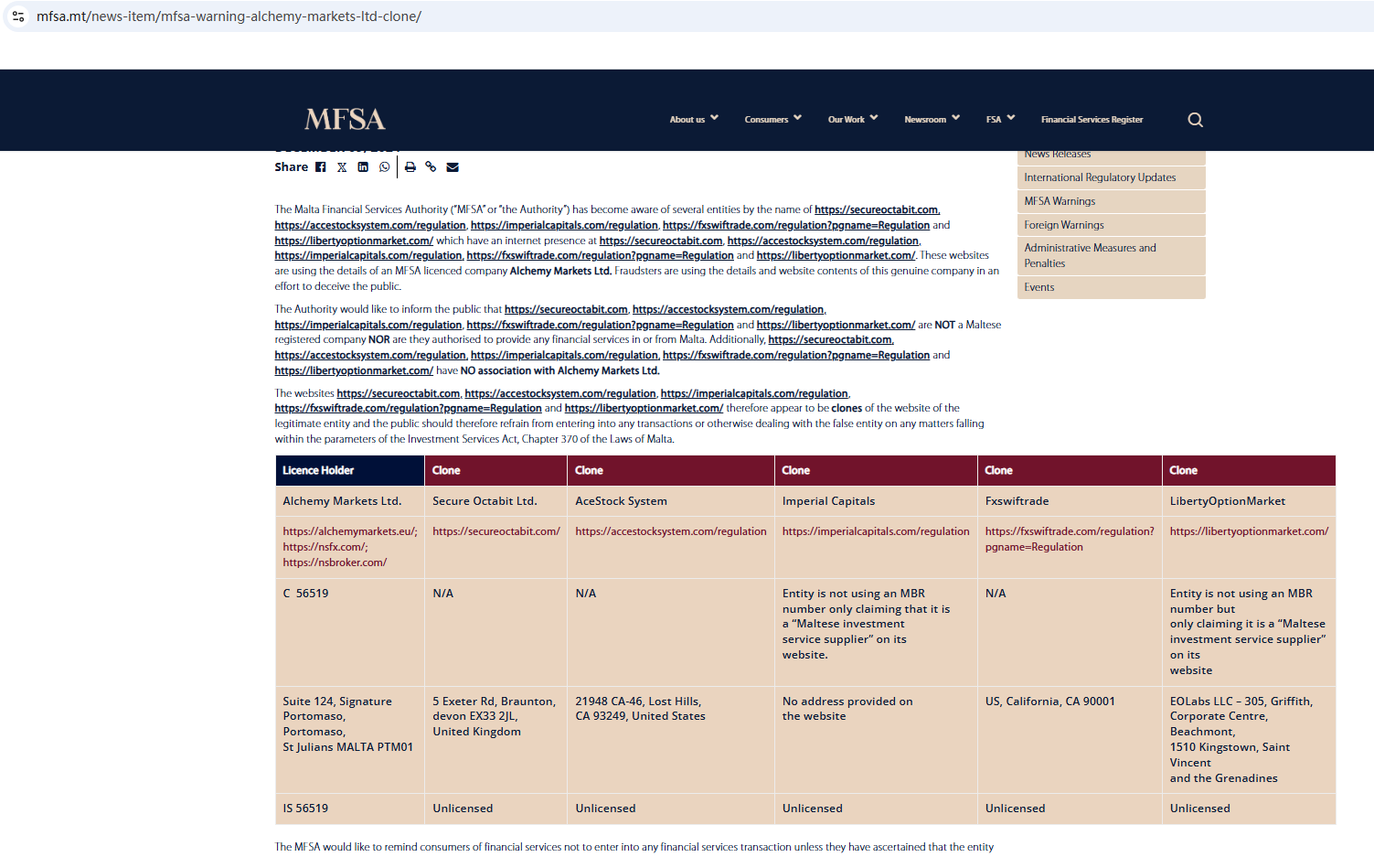In addition, the Malta Financial Services Authority (MFSA) issued a warning against secureoctabit.com, identifying this company as a clone of an MFSA-authorized firm.