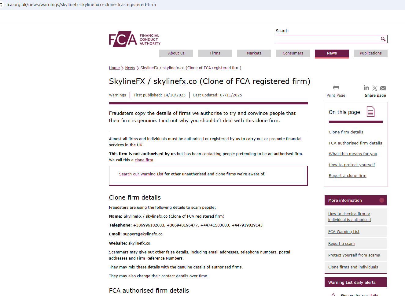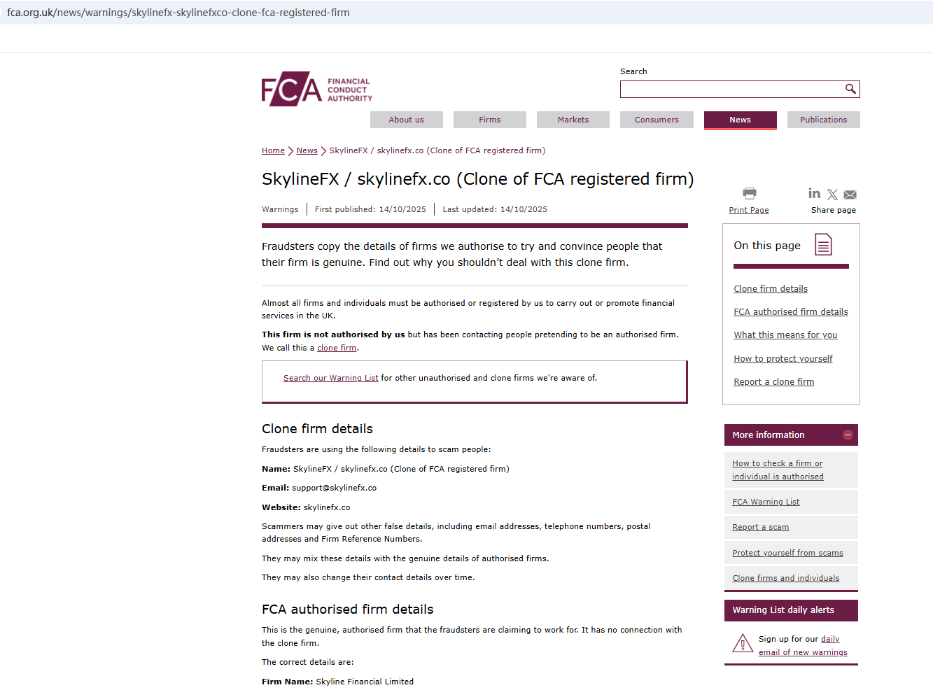 On Oct 14, 2025, the Financial Conduct Authority (FCA) flagged skylinefx.co, identifying it as a clone firm. https://www.fca.org.uk/news/warnings/skylinefx-skylinefxco-clone-fca-registered-firm