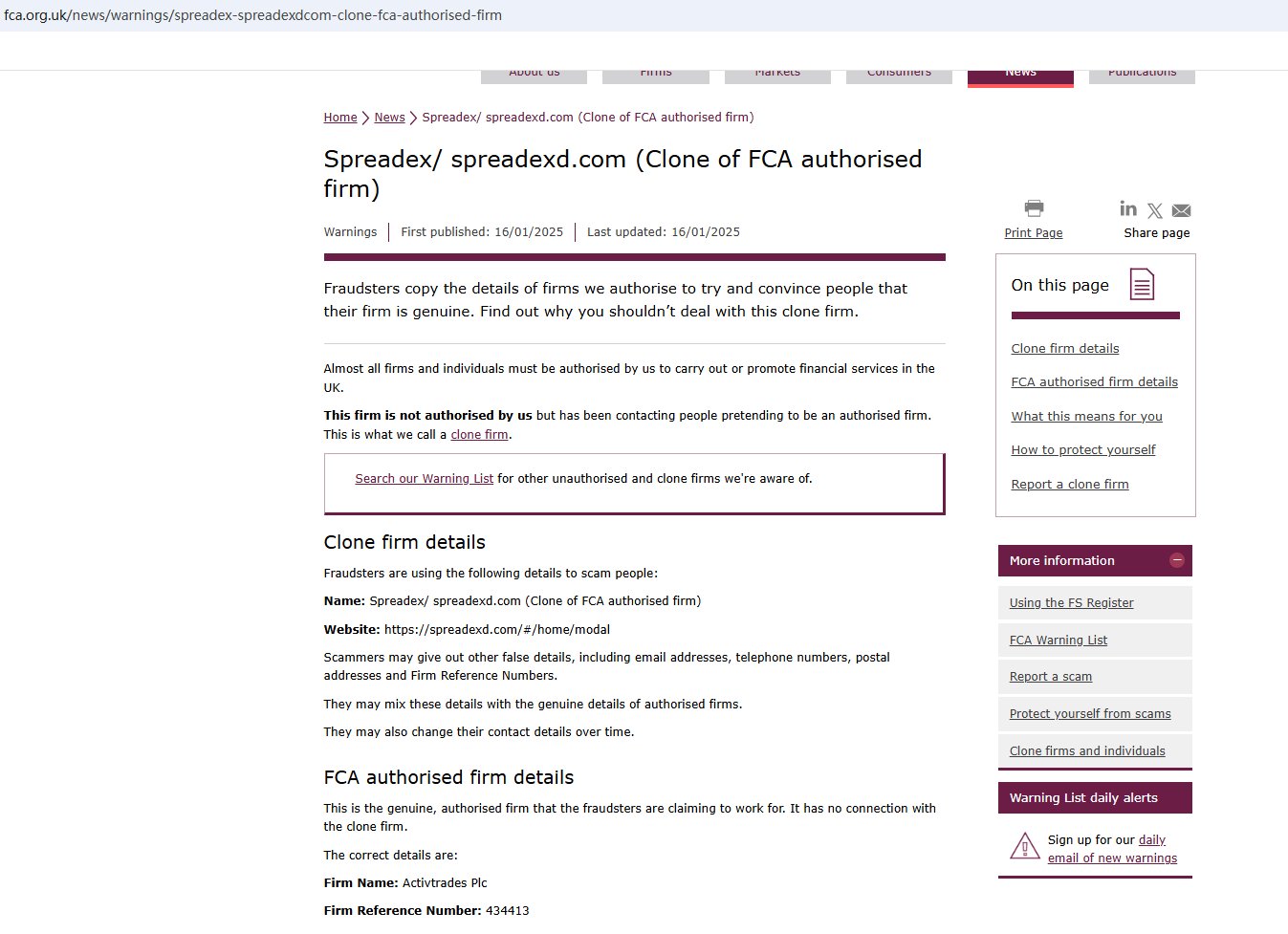 On January 16, 2025, the Financial Conduct Authority (FCA) issued a warning against spreadexd.com, believing this company might be providing financial services or products without proper authorization in the UK. https://www.fca.org.uk/news/warnings/spreadex-spreadexdcom-clone-fca-authorised-firm