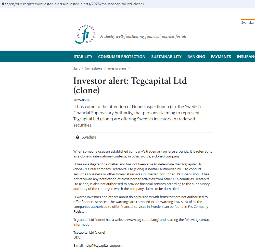 What's more, we found that the Finansinspektionen (FI) issued a warning against tcg-capital.org, suspecting that it is not a real company.