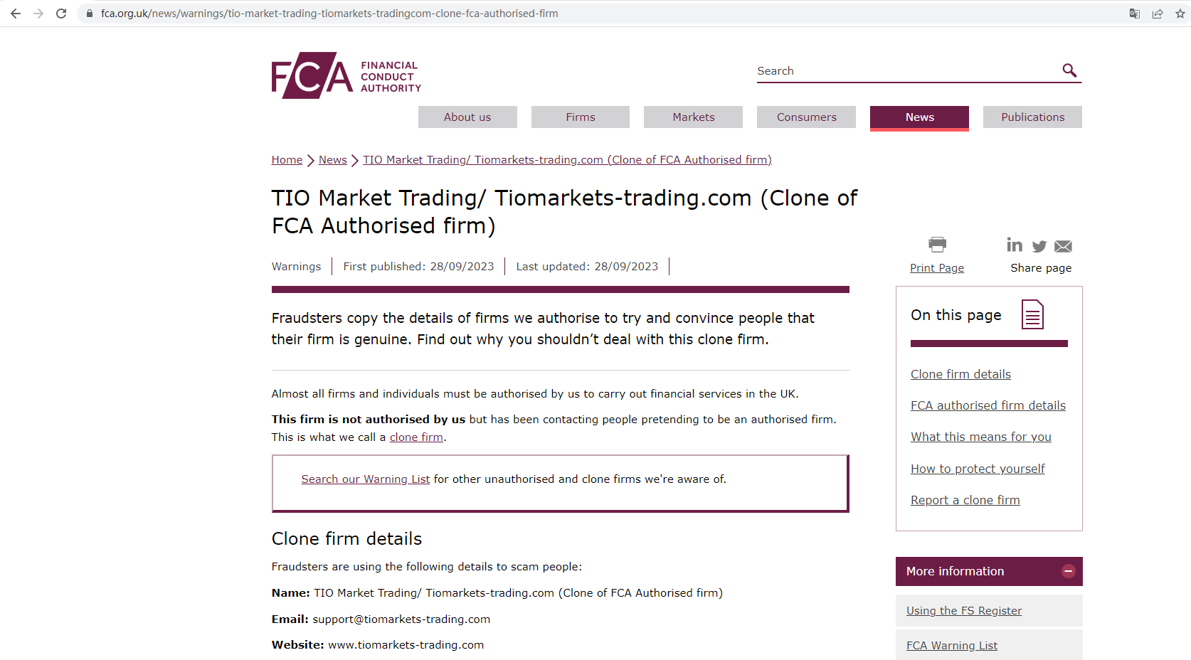 The United Kingdom Financial Conduct Authority (UK FCA) issued a warning that Clone TIO Market Trading was a clone of FCA authorised firm, TIO Markets UK Limited.