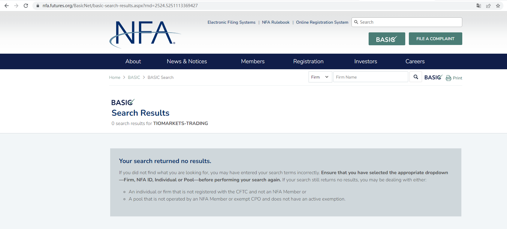 Clone TIO Market Trading claims to be regulated in United States of America, to operate as this type of broker in the United States, a company must be registered with the Commodity Futures Trading Commission (CFTC) and to be a member of the National Futures Association (NFA). GTS FINANCIAL is not listed among the members of the NFA. It is a red flag.